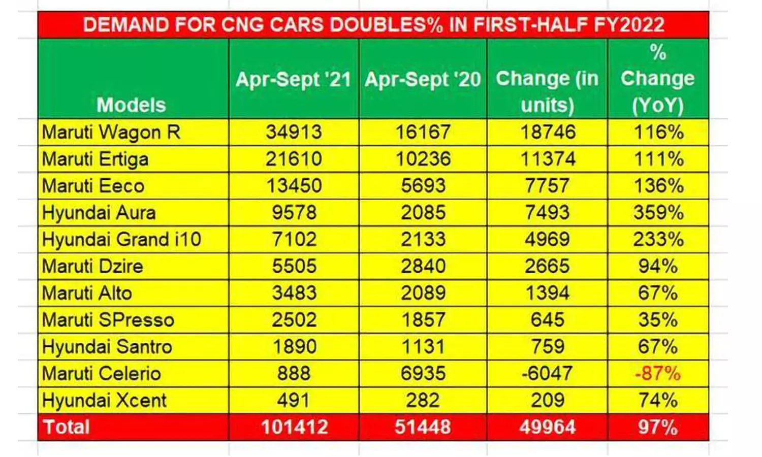 അതേസമയം സിഎൻജി കാറുകളുടെ വിൽപ്പനയിൽ വലിയ കുതിച്ചുചാട്ടമുണ്ടാകുമ്പോഴാണ് ഇത്തരത്തിൽ സിഎൻജി വിലയിലും വൻ വർധനവുണ്ടാകുന്നത്. 66 ശതമാനമാണ് സിഎൻജി വാഹനങ്ങളുടെ വിൽപ്പനയിൽ ഈ വർഷം മാത്രം വർധനവുണ്ടായത്. 1,01,412 സിഎൻജി വാഹനങ്ങളാണ് കഴിഞ്ഞ വർഷം ഏപ്രിൽ മുതൽ ഈ വർഷം സെപ്റ്റംബർ വരെ നിരത്തിലിറങ്ങിയത്.