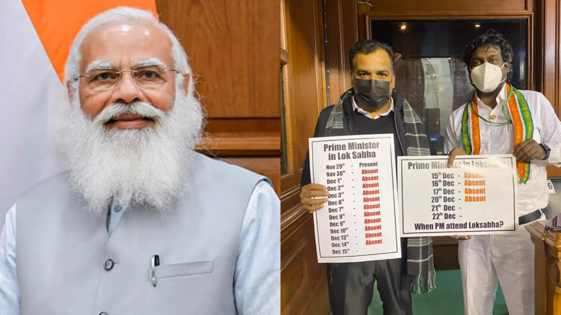 കോണ്ഗ്രസ് എം.പിമാരായ മാണിക്കം ടാഗോറും വിജയ് വസന്തും മോദിയുടെ ഹാജര് നില സൂചിപ്പിക്കുന്ന പ്ലക്കാര്ഡും പിടിച്ച് നില്ക്കുന്ന ഫോട്ടോയാണ് സമൂഹ മാധ്യമങ്ങളില് പ്രചരിക്കുന്നത്. പ്രധാനമന്ത്രി എന്ന് ലോക്സഭയിലെത്തുമെന്ന ചോദ്യവും പ്ലക്കാര്ഡിലുണ്ട്. ഹാജര് വിഷയത്തില് സ്വയം മാറണമെന്നും അല്ലെങ്കില് മാറ്റമുണ്ടാകുമെന്നും എം.പിമാരെ വിമര്ശിച്ച മോദി തന്നെ പാര്ലമെന്റില് ഹാജരാകാതിരുന്നതാണ് വ്യാപകമായി ചര്ച്ചചെയ്യപ്പെടുന്നത്. ഇക്കഴിഞ്ഞ ബി.ജെ.പി പാര്ലമെന്ററി പാര്ട്ടി യോഗത്തിലായിരുന്നു പ്രധാനമന്ത്രി എം.പിമാരെ വിമര്ശിച്ചത്.