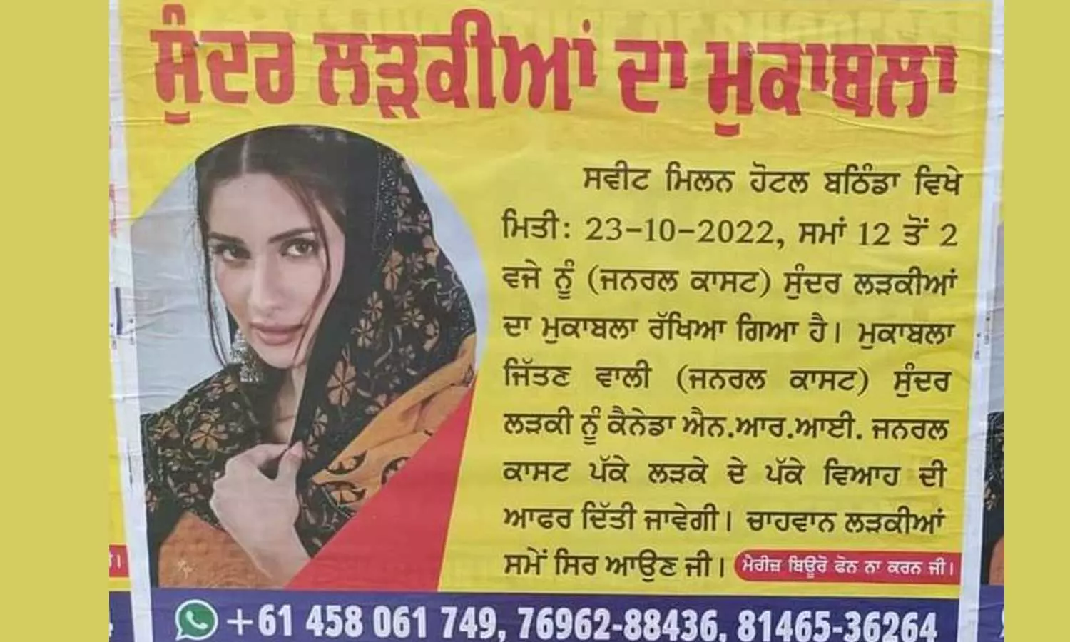 പഞ്ചാബിലെ ബതിൻഡയിലാണ് വിചിത്രകരമായ സൗന്ദര്യ മത്സരത്തിന്റെ പോസ്റ്ററുകൾ വ്യാപകമായി പതിച്ചിരുന്നത്. ഈ മാസം 23ന് നഗരത്തിലെ ഒരു ഹോട്ടലിൽ വച്ച് മത്സരം നടക്കുമെന്നാണ് പോസ്റ്ററിൽ സൂചിപ്പിച്ചിരുന്നത്. 'ഉന്നത ജാതി'യിലെ പെൺകുട്ടികൾക്കു മാത്രമാണ് മത്സരമെന്നും വ്യക്തമാക്കിയിരുന്നു.
