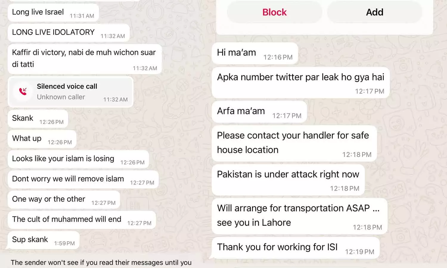 ''എന്റെ ഫോൺ നമ്പറും ഇമെയിലും ട്വിറ്ററിൽ ചോർന്നു. കഴിഞ്ഞ 24 മണിക്കൂറായി തുടർച്ചയായ ഭീഷണി സന്ദേശങ്ങളും കോളുകളും ലഭിക്കുന്നു. ഇത് ഉപദ്രവമാണ്. അപകടകരമാണ്. ഇത് അനുവദിക്കാൻ കഴിയില്ല''-അർഫ എക്സിൽ കുറിച്ചു.