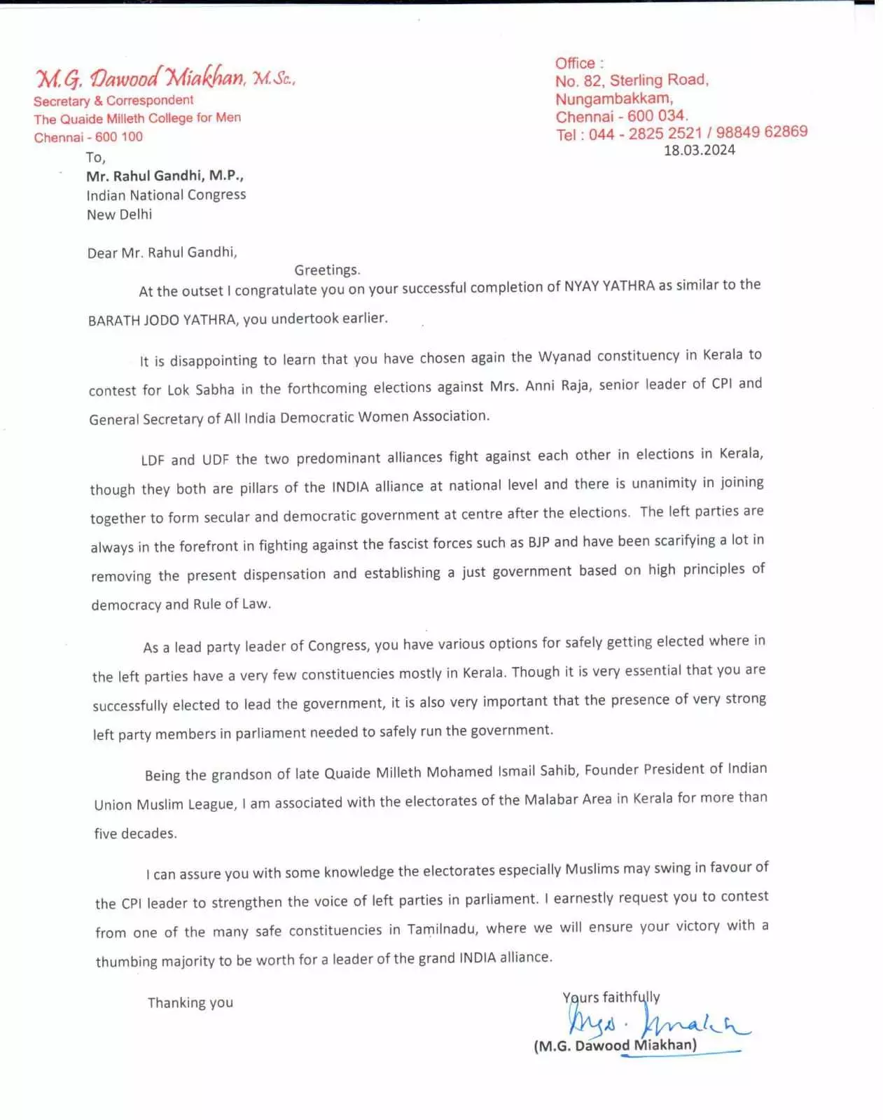 വയനാട് ലോക്സഭാ മണ്ഡലത്തിൽ മത്സരിക്കുന്നത് പുനഃപരിശോധിക്കണമെന്ന് കോൺഗ്രസ് നേതാവ് രാഹുൽ ഗാന്ധിയോട് ഇന്ത്യൻ യൂണിയൻ മുസ്ലിം ലീഗ് പാർട്ടി സ്ഥാപകൻ ഖാഇദെ മില്ലത്ത് മുഹമ്മദ് ഇസ്മാഈൽ സാഹിബിന്റെ ചെറുമകൻ ദാവൂദ് മിയാഖാൻ. കമ്മ്യൂണിസ്റ്റ് പാർട്ടി ഓഫ് ഇന്ത്യയുടെ മുതിർന്ന നേതാവും നാഷണൽ വിമൻസ് ഫെഡറേഷൻ ഓഫ് ഇന്ത്യയുടെ (NFWI) ജനറൽ സെക്രട്ടറിയുമായ ആനി രാജയ്ക്കെതിരെ വയനാട് ലോക്സഭാ സീറ്റിൽ മത്സരിക്കാൻ തീരുമാനിച്ചത് നിരാശാജനകമാണെന്നും അദ്ദേഹം രാഹുലിന് അയച്ച കത്തിൽ പറഞ്ഞു. കേരളത്തിൽ പരസ്പരം മത്സരിക്കുന്നുണ്ടെങ്കിലും ദേശീയ തലത്തിൽ ഇൻഡ്യ മുന്നണിയുടെ രണ്ട് പ്രധാന സ്തംഭങ്ങളാണ് മുൻനിര മുന്നണികളായ എൽഡിഎഫും യുഡിഎഫും എന്നത് നിഷേധിക്കാനാവില്ലെന്നും തെരഞ്ഞെടുപ്പിന് ശേഷം കേന്ദ്രത്തിൽ മതേതര ജനാധിപത്യ സർക്കാർ രൂപീകരിക്കുന്നതിൽ അവയ്ക്ക് ഏകാഭിപ്രായമാണെന്നും ചൂണ്ടിക്കാട്ടി.