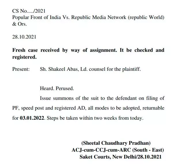 അസമിലെ ദറങിലെ പൊലീസ് വെടിവെപ്പിനെ തുടര്ന്ന് പോപുലര് ഫ്രണ്ടിനെതിരേ അപകീര്ത്തികരമായ വാര്ത്ത സംപ്രേഷണം ചെയ്തെന്ന പരാതിയിലാണ് സമന്സ് നല്കിയിരിക്കുന്നത്. സെപ്തംബര് 27നാണ് റിപ്പബ്ലിക് ടിവി പോപ്പുലര് ഫ്രണ്ടിനെതിരെ അപകീര്ത്തിപരമായ വാര്ത്ത സംപ്രേക്ഷപണം ചെയ്തത്. അസമിലെ ദരംഗ് ജില്ലയില് നടന്ന വെടിവെപ്പില് പോപ്പുലര് ഫ്രണ്ട് ബന്ധമുള്ള രണ്ട് പേര് അറസ്റ്റിലായെന്നായിരുന്നു ചാനല് വാര്ത്ത നല്കിയത്. സംഘടനക്കെതിരേ അപകീര്ത്തിപരമായ വാര്ത്ത സംപ്രേഷണം ചെയ്ത റിപ്പബ്ലിക് ടിവിക്കെതിരേ പോപുലര് ഫ്രണ്ട് വക്കീല് നോട്ടീസ് അയച്ചിരുന്നു. ഒരു ലക്ഷം രൂപ നഷ്ടപരിഹാരം നൽകണമെന്നും സംഘടനയുടെ പ്രതിച്ഛായ നശിപ്പിക്കുന്ന തരത്തിലുള്ള വാർത്തകൾ തങ്ങളുടെ ചാനലിലോ വെബ്സൈറ്റിലോ റിപ്പോർട്ട് ചെയ്യുന്നതിൽ നിന്ന് ചാനലിനെതിരെ നിർബന്ധിത വിലക്ക് ഏര്പ്പെടുത്തണമെന്നും ആവശ്യപ്പെട്ടാണ് പി.എഫ്.ഐ കേസ് ഫയല് ചെയ്തത്.
