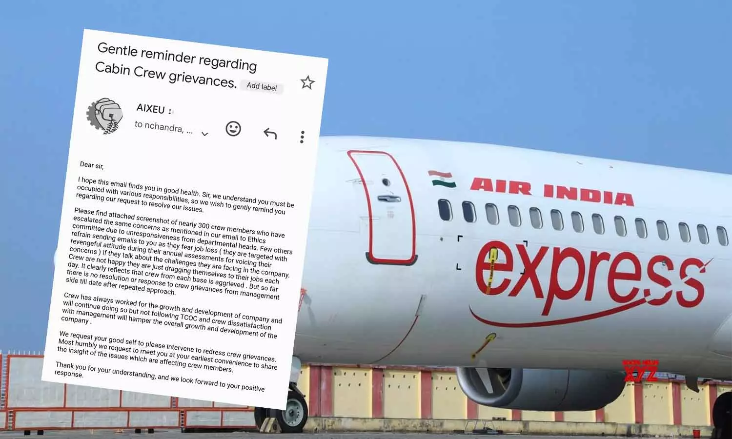 കഴിഞ്ഞ മാസം 26നാണ് എയർ ഇന്ത്യ എക്സ്പ്രസ് ജീവനക്കാർ എയർ ഇന്ത്യ ലിമിറ്റഡ് ചെയർമാന് വിവിധ ആരോപണങ്ങളുമായി കത്തയച്ചത്. ടാറ്റ എയർ ഇന്ത്യ ഏറ്റെടുത്തതിന് ശേഷം തൊഴിലാളി വിരുദ്ധമായ നടപടികളാണ് സ്വീകരിക്കുന്നതെന്ന് കത്തിൽ പറയുന്നു. ശമ്പള വർധനയില്ല, അലവൻസുകൾ നൽകുന്നില്ല, അനാവശ്യമായി പിരിച്ചുവിടുന്നു, നിയമനത്തിൽ സ്വജനപക്ഷപാതം നടപ്പാക്കുന്നു തുടങ്ങിയ ആരോപണങ്ങളാണ് ജീവനക്കാർ ഉന്നയിക്കുന്നത്.