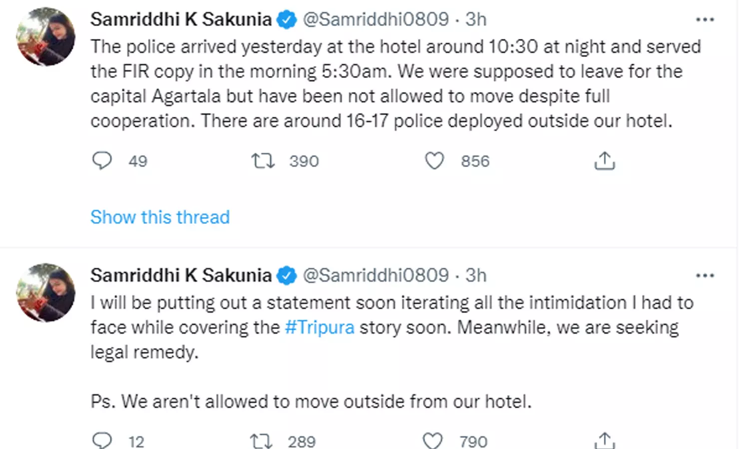ത്രിപുരയിൽ മുസ്ലിംങ്ങൾക്ക് നേരെയുള്ള അതിക്രമങ്ങൾ റിപ്പോർട്ട് ചെയ്യാനെത്തിയ വനിതാ മാധ്യമപ്രവർത്തകരെ ബിജെപി സർക്കാർ ഹോട്ടലിൽ തടങ്കലിലാക്കി. വിശ്വഹിന്ദു പരിഷത്ത് (വി.എച്ച്.പി) മുസ്ലിം പള്ളികൾ തകർക്കുന്നതിന്റെ വാർത്തകളും ദൃശ്യങ്ങളും പുറത്തുവിട്ടതിനാണ് മാധ്യമപ്രവർത്തകരായ സമൃദ്ധി കെ. സകുനിയ, സ്വർണ എന്നിവരെ ഹോട്ടലിൽ തടങ്കലാക്കിയത്.
