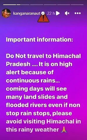 ''ഹിമാചൽ പ്രദേശിലേക്ക് യാത്ര ചെയ്യരുത്…. തുടർച്ചയായി മഴ പെയ്യുന്നതിനാൽ അതീവ ജാഗ്രതയിലാണ്... നിർത്താതെയുള്ള മഴ നിലച്ചാലും വരും ദിവസങ്ങളിൽ നിരവധി ഉരുൾപൊട്ടലുകളും നദികളിൽ വെള്ളപ്പൊക്കവും ഉണ്ടാകും. ഈ മഴയുള്ള കാലാവസ്ഥയിൽ ഹിമാചൽ സന്ദർശിക്കുന്നത് ഒഴിവാക്കുക'' നടി കുറിച്ചു. ഹിമാലയത്തിലെ സ്ഥിതി നല്ലതല്ല. എന്നിരുന്നാലും അസാധാരണമായി ഒന്നുമില്ല. എല്ലാത്തിനുമുപരി, മഴക്കാലത്ത് ഇത് ഇങ്ങനെയാണ്. തമാശയല്ല, നിങ്ങൾ എവിടെയാണോ അവിടെ തന്നെ തുടരുക. ദയവായി സാഹസികത കാണിക്കാൻ നല്ല സമയമല്ല. ബിയാസ് അതിന്റെ അലറുന്ന രൂപത്തിലാണ്.ഗർജ്ജിക്കുന്ന ശബ്ദം കൊണ്ട് നിങ്ങൾക്ക് ഹൃദയാഘാതം ഉണ്ടാകും. മഴക്കാലത്ത് ഹിമാചലിലേക്ക് പോകരുത്, ”അവർ കൂട്ടിച്ചേർത്തു.