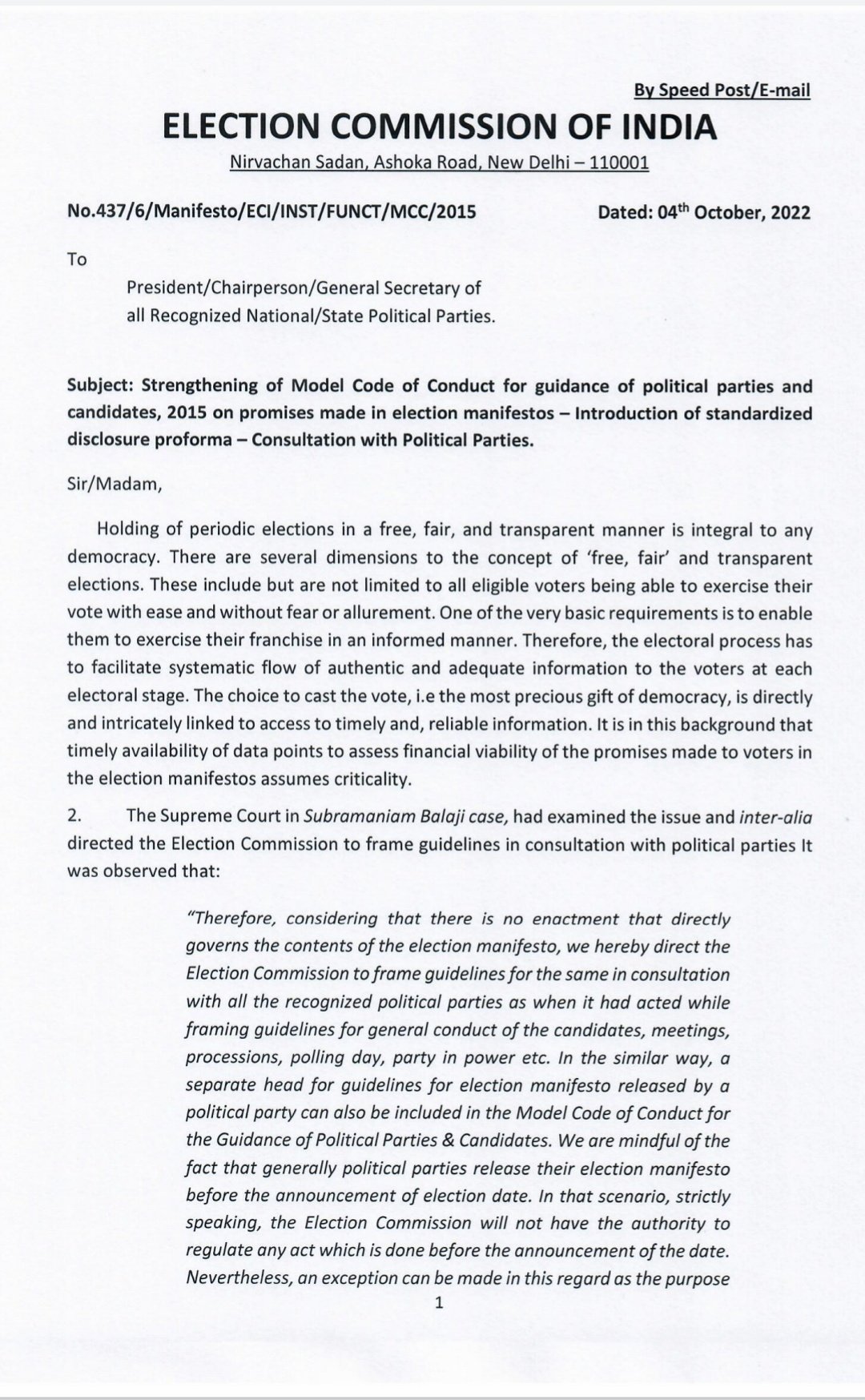 |വാഗ്ദാനങ്ങൾ എങ്ങനെ നടപ്പാക്കുമെന്ന് വിവരിക്കുന്നത് വഴി അവ വെറുംവാക്കാകുന്നത് തടയാനുള്ള സാഹചര്യം കുറയ്ക്കുകയും പാർട്ടികൾക്കിടയിൽ താരതമ്യം നടത്താൻ പൗരന്മാരെ സഹായിക്കുകയുമാണ് തെരഞ്ഞെടുപ്പ് കമ്മീഷൻ ലക്ഷ്യമിടുന്നത്