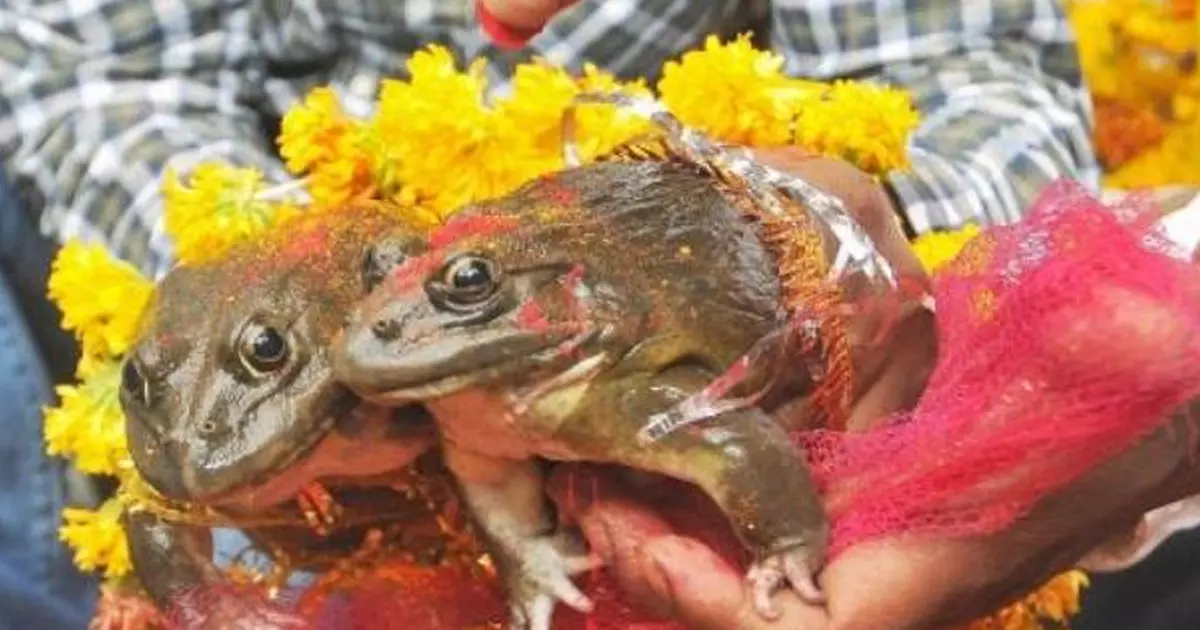 ഗൊരഖ്പൂരിലെ കാളിബാരി ക്ഷേത്രത്തിൽ ഹിന്ദു മഹാസംഘാണ് ചടങ്ങ് സംഘടിപ്പിച്ചത്. ആചാരങ്ങളെല്ലാം പാലിച്ചു നടത്തിയ 'വിവാഹം' കാണാൻ ആളുകൾ കൂട്ടത്തോടെ ഒഴുകിയെത്തി. തവളകളെ മല ചാര്ത്തിച്ച് പുഷ്പവൃഷ്ടി നടത്തി.