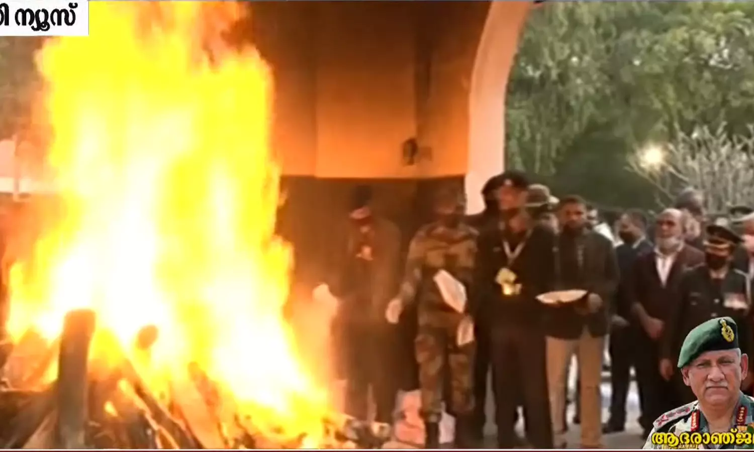|ഡൽഹിയിലെ ബ്രാർ സ്ക്വയറിൽ വൈകുന്നേരം 4.50 ന് ആദരസൂചകമായി 17 തവണ സൈന്യം ഗൺ സല്യൂട്ട് നൽകിയതിന് പിന്നാലെ 'ബിപിൻ റാവത്ത് അമർ രഹേ മുദ്രാവാക്യങ്ങൾക്ക് നടുവിൽ അദ്ദേഹത്തിന്റെ ഭൗതികദേഹം അഗ്നിയിൽ ലയിച്ചു.