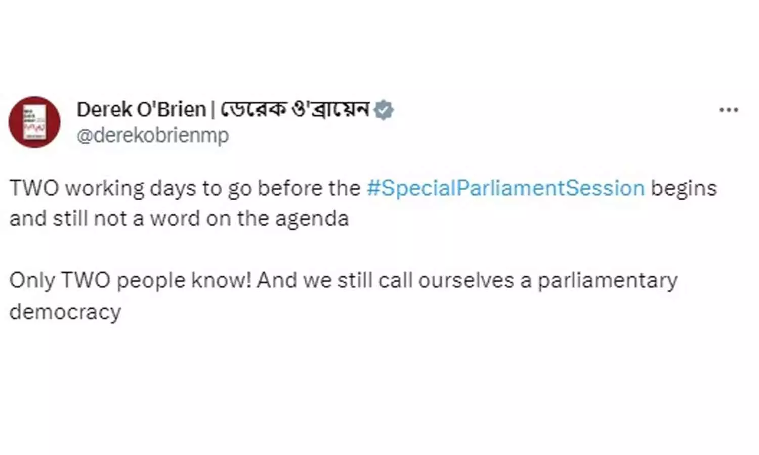 പ്രത്യേക സമ്മേളനത്തിന്റെ അജണ്ട എന്താണെന്ന് വെളിപ്പെടുത്താൻ ഇതുവരെ കേന്ദ്രസർക്കാർ തയ്യാറായിട്ടില്ല. ഇതിനെതിരെ പ്രതിപക്ഷം വിമർശനവുമായി രംഗത്തെത്തിയിരുന്നു. 'പ്രത്യേക പാർലമെന്റ് സമ്മേളനത്തിന്റെ അജണ്ടയെക്കുറിച്ച് ഒരുവാക്ക് പോലും പറയാൻ കേന്ദ്രം തയ്യാറായിട്ടില്ല. രണ്ടുപേർക്ക് മാത്രമേ അറിയൂ! എങ്കിലും നമ്മൾ ഇപ്പോഴും സ്വയം വിളിക്കുന്നത് പാർലമെന്ററി ജനാധിപത്യം എന്നാണ്'-തൃണമൂൽ കോൺഗ്രസ് എം.പി ഡെറിക് ഒബ്രിയാൻ ട്വീറ്റ് ചെയ്തു.