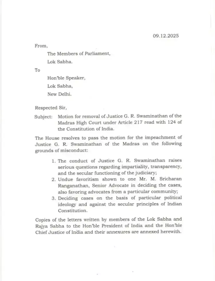തിരുപ്പറംകുണ്ഡ്രം ദീപം തെളിക്കൽ; ജസ്റ്റിസ് ജി.ആര് സ്വാമിനാഥനെതിരെ ഇംപീച്ച്മെന്റ് നീക്കവുമായി ഡിഎംകെ