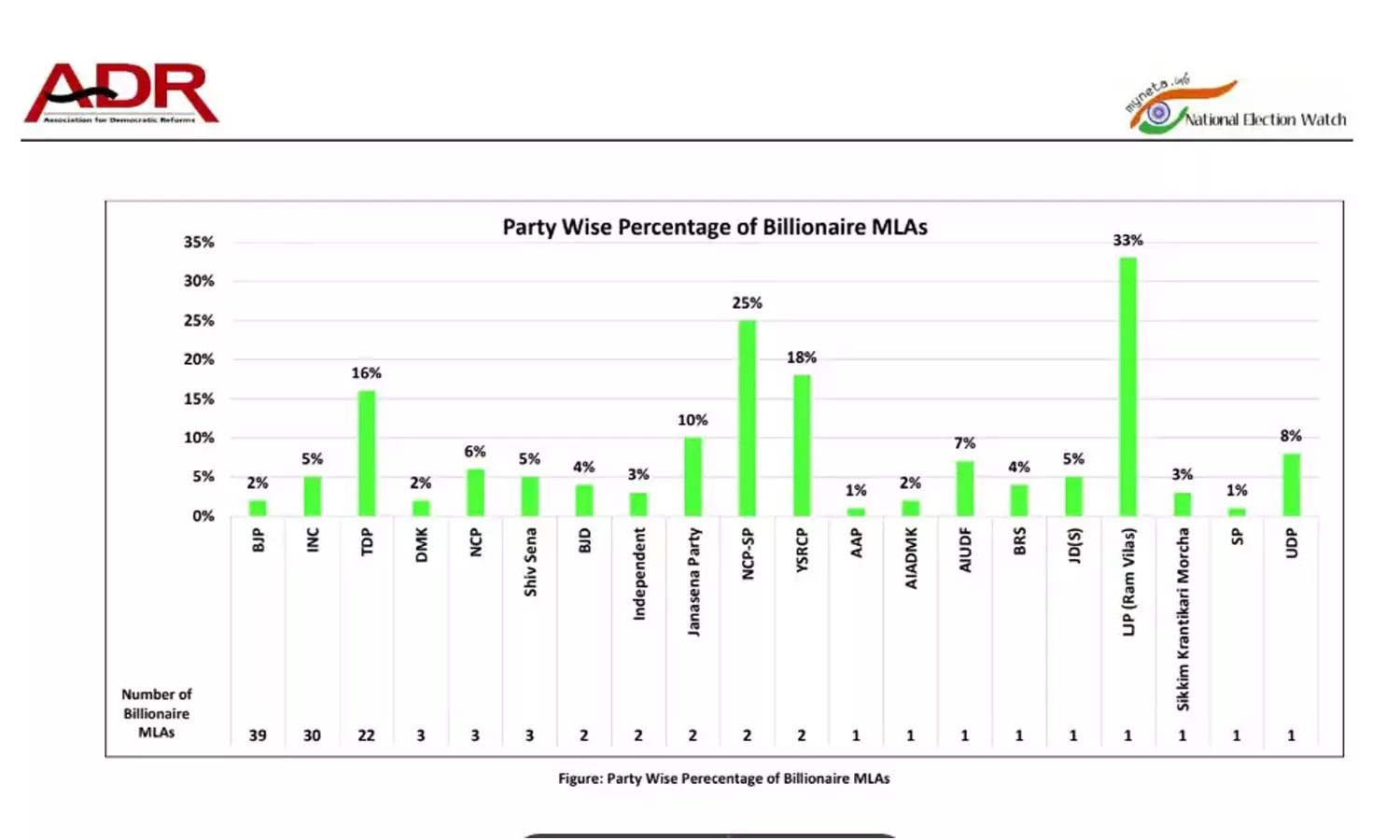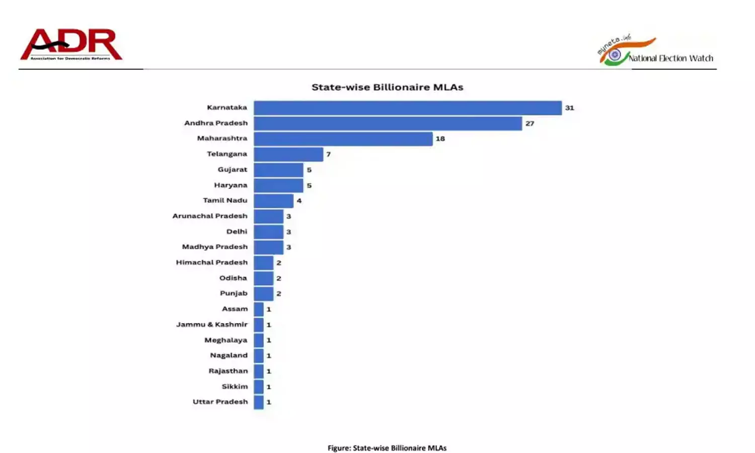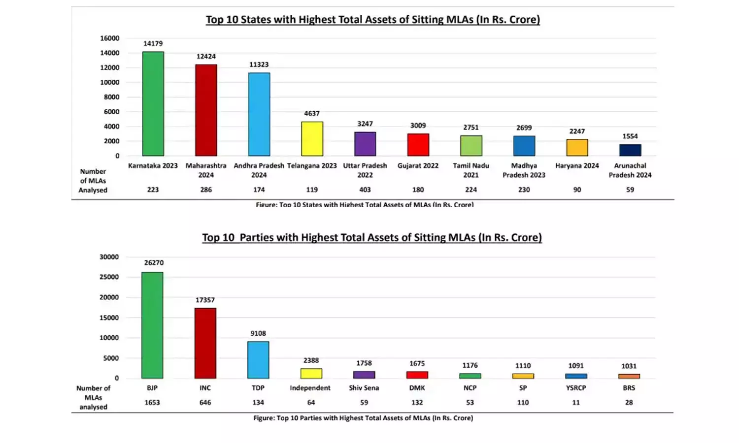 4092 സിറ്റിങ് എംഎൽഎമാരുടെ ആകെ ആസ്തി 73,348 കോടിയാണ്. 2023-24ലെ നാഗാലാൻഡ് (23,086 കോടി രൂപ), ത്രിപുര (26,892 കോടി രൂപ), മേഘാലയ (22,022 കോടി രൂപ) എന്നീ സംസ്ഥാനങ്ങളുടെ മൊത്തം വാർഷിക ബജറ്റുകളുടെ ആകെ തുകയേക്കാൾ വരുമിത്.