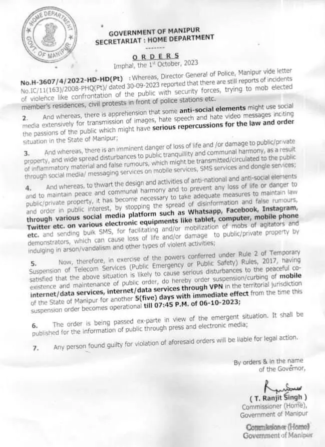 മണിപ്പൂരിലെ ഇന്റർനെറ്റ് നിരോധനം നീട്ടി