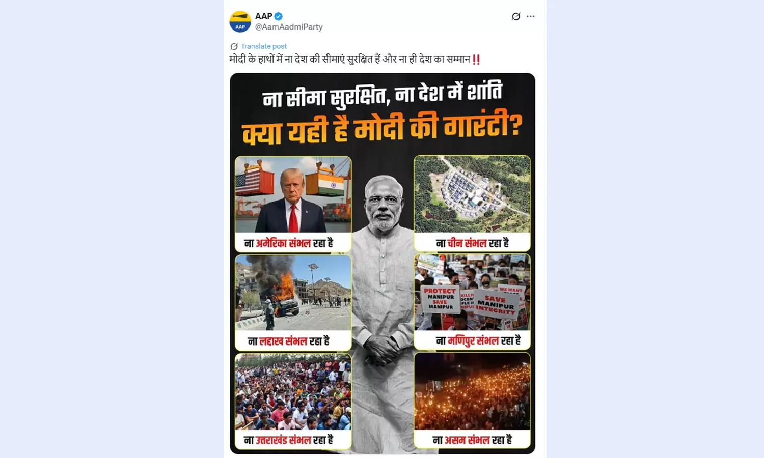 യുഎസുമായുള്ള താരിഫ് യുദ്ധവും ചൈനയുമായുള്ള അതിർത്തി തർക്കവും മണിപ്പൂർ അടക്കമുള്ള വിഷയങ്ങളും കൈകാര്യം ചെയ്യുന്നതിൽ മോദി സർക്കാർ പരാജയമാണെന്ന് ചൂണ്ടിക്കാട്ടി എക്സിൽ പങ്കുവച്ച പോസ്റ്ററിലൂടെയാണ് ആം ആദ്മി പാർട്ടിയുടെ കടന്നാക്രമണം. 'മോദിയുടെ കൈകളിൽ രാജ്യത്തിന്റെ അതിർത്തികൾ സുരക്ഷിതമല്ല. രാജ്യത്ത് ശാന്തിയില്ല. ഇതാണോ മോദിയുടെ ഉറപ്പ്?'- പോസ്റ്ററിൽ ചോദിക്കുന്നു.