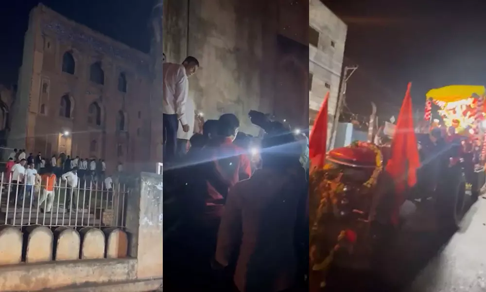 ദസറ ഘോഷയാത്രക്കിടെ ഒരു സംഘം മഹമൂദ് ഗവാൻ മദ്രസയുടെ പൂട്ട് തകർത്ത് അകത്ത് കടക്കുകയായിരുന്നു