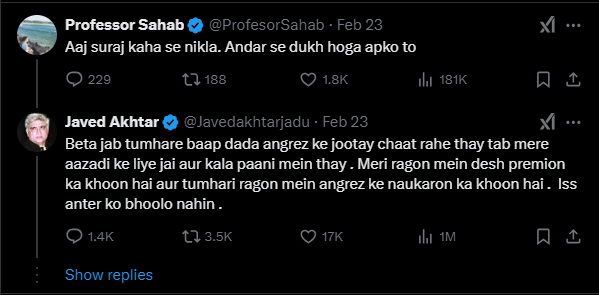 ' മകനെ, നിൻ്റെ അച്ഛനും മുത്തച്ഛനും ബ്രിട്ടീഷുകാരുടെ ഷൂ നക്കുമ്പോൾ സ്വാതന്ത്ര്യത്തിന് വേണ്ടിയായിരുന്നു ഞങ്ങള് പോരാടിയിരുന്നത്. എന്റെ സിരകളിൽ രാജ്യസ്നേഹികളുടെ രക്തമാണ്, നിങ്ങളുടെ സിരകളിലുള്ളത് ബ്രിട്ടീഷ് സേവകരുടെതും. ഇത് രണ്ടും തമ്മില് വ്യത്യാസമുണ്ട്, അത് മറക്കരുത് എന്നായിരുന്നു'- മറുപടി. അതേസമയം നിരവധി പേരാണ് ജാവേദിനെ പിന്തുണച്ച് രംഗത്ത് എത്തിയത്. ഈ കമന്റിനും വന് പിന്തുണ ലഭിച്ചു.