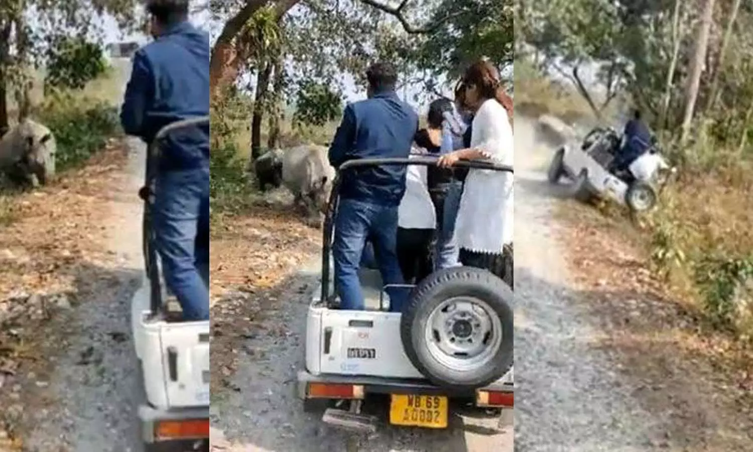 ഫോട്ടോയെടുക്കുന്നതിനിടെ കാണ്ടാമൃഗം പാഞ്ഞടുത്തു; ജീപ്പ് മറിഞ്ഞ് ഏഴുസഞ്ചാരികൾക്ക് പരിക്ക്-വീഡിയോ