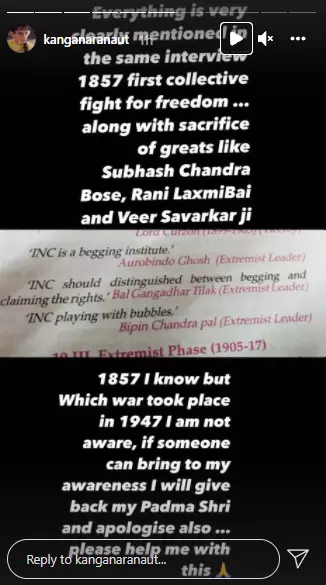 ഇൻസ്റ്റഗ്രാം സ്റ്റോറീസിലാണ് നടിയുടെ പ്രതികരണം. 'ആ അഭിമുഖത്തിൽ എല്ലാ കാര്യവും വ്യക്തമായി പറഞ്ഞിട്ടുണ്ട്. 1857ലേതായിരുന്നു (ബ്രിട്ടീഷുകാർക്കെതിരെ) ആദ്യത്തെ സ്വാതന്ത്ര്യസമരം. അതോടു കൂടെ സുഭാഷ് ചന്ദ്രബോസ്, റാണി ലക്ഷ്മി ഭായ്, വീർ സവർക്കർജി തുടങ്ങിയവരുടെ സമർപ്പണങ്ങൾ. 1947ൽ ഏതു യുദ്ധം നടന്നു എന്നെനിക്കറിയില്ല. 1857ലേത് അറിയാം. ആരെങ്കിലും അതേക്കുറിച്ച് പറഞ്ഞുതരുമെങ്കിൽ എന്റെ പത്മ പുരസ്കാരങ്ങൾ തിരിച്ചു നൽകാം. മാപ്പും പറയാം. ദയവായി എന്നെയിതിൽ സഹായിക്കൂ' - നടി കുറിച്ചു.