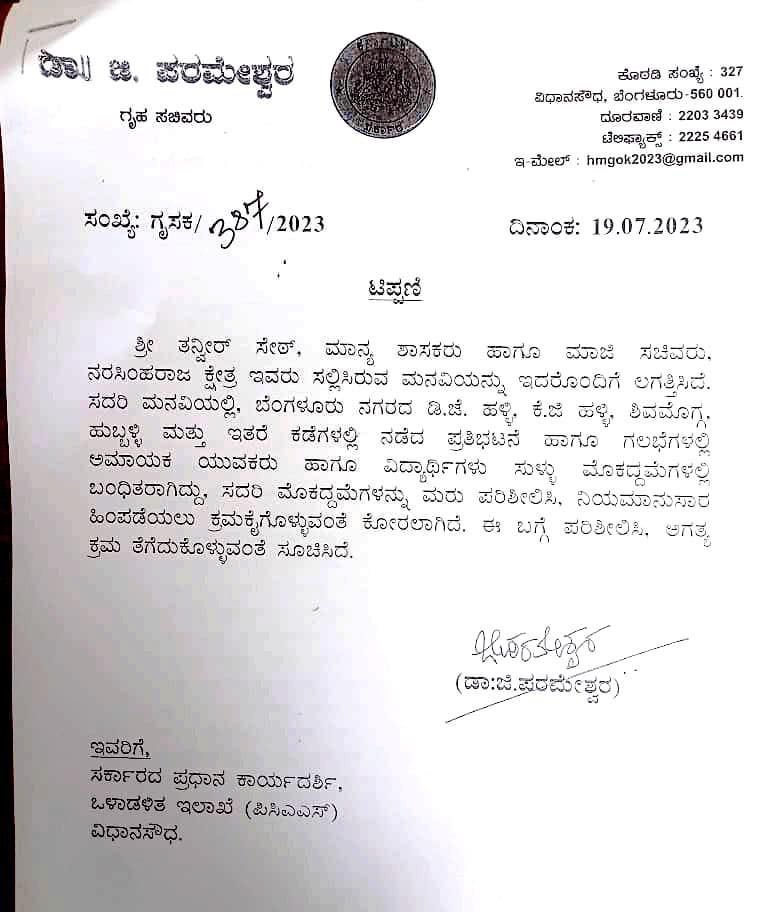 ബെംഗളൂരു: 2020 ബെംഗളൂരു കലാപകാലത്ത് അറസ്റ്റിലായി ജയിലിൽ കഴിയുന്ന നിരപരാധികളെ വിട്ടയക്കാനുള്ള നടപടികള്ക്ക് നിര്ദ്ദേശം നല്കി കര്ണാടക ആഭ്യന്തര വകുപ്പ്. ബി.ജെ.പി സര്ക്കാരിന്റെ കാലത്ത് കര്ണാടകയുടെ വിവിധ ഭാഗങ്ങളില് നടന്ന പ്രതിഷേധ പ്രകടനങ്ങളുടെയും അക്രമങ്ങളുടെയും പേരില് വ്യാജ കേസില് അറസ്റ്റിലായ നിരപരാധികളായ യുവാക്കള്ക്കും വിദ്യാര്ഥികള്ക്കുമെതിരായ കേസുകള് ചട്ടപ്രകാരം പിന്വലിക്കുമെന്ന് ആഭ്യന്തര മന്ത്രി ഡോ.ജി.പരമേശ്വര പറഞ്ഞു. വിഷയം പരിശോധിച്ച് ആവശ്യമായ നടപടി സ്വീകരിക്കണമെന്ന് ആഭ്യന്തര മന്ത്രി പ്രിന്സിപ്പല് സെക്രട്ടറിക്ക് ഉത്തരവ് നല്കി. മൈസൂരു നരസിംഹരാജ മണ്ഡലത്തില് നിന്നുള്ള കോണ്ഗ്രസ് എം.എല്.എ തന്വീര് സേഠ് ആവശ്യപ്രകാരമാണ് നടപടി.