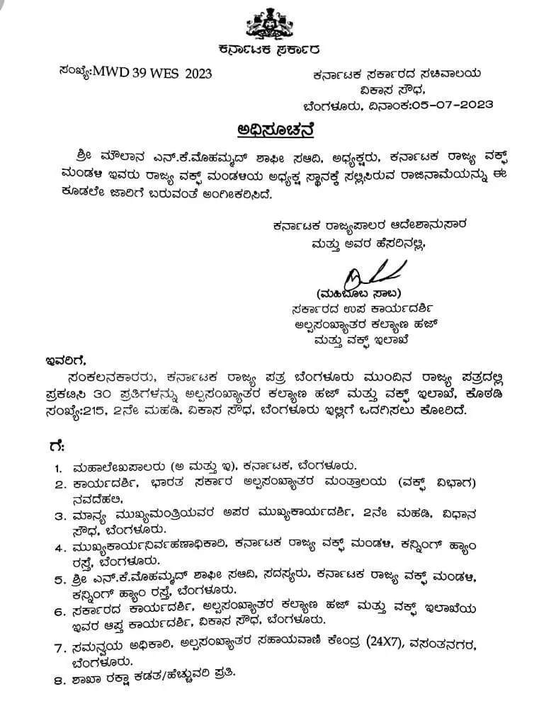 Karnataka Waqf Board Chairman NKM Shafi Saadi has resigned