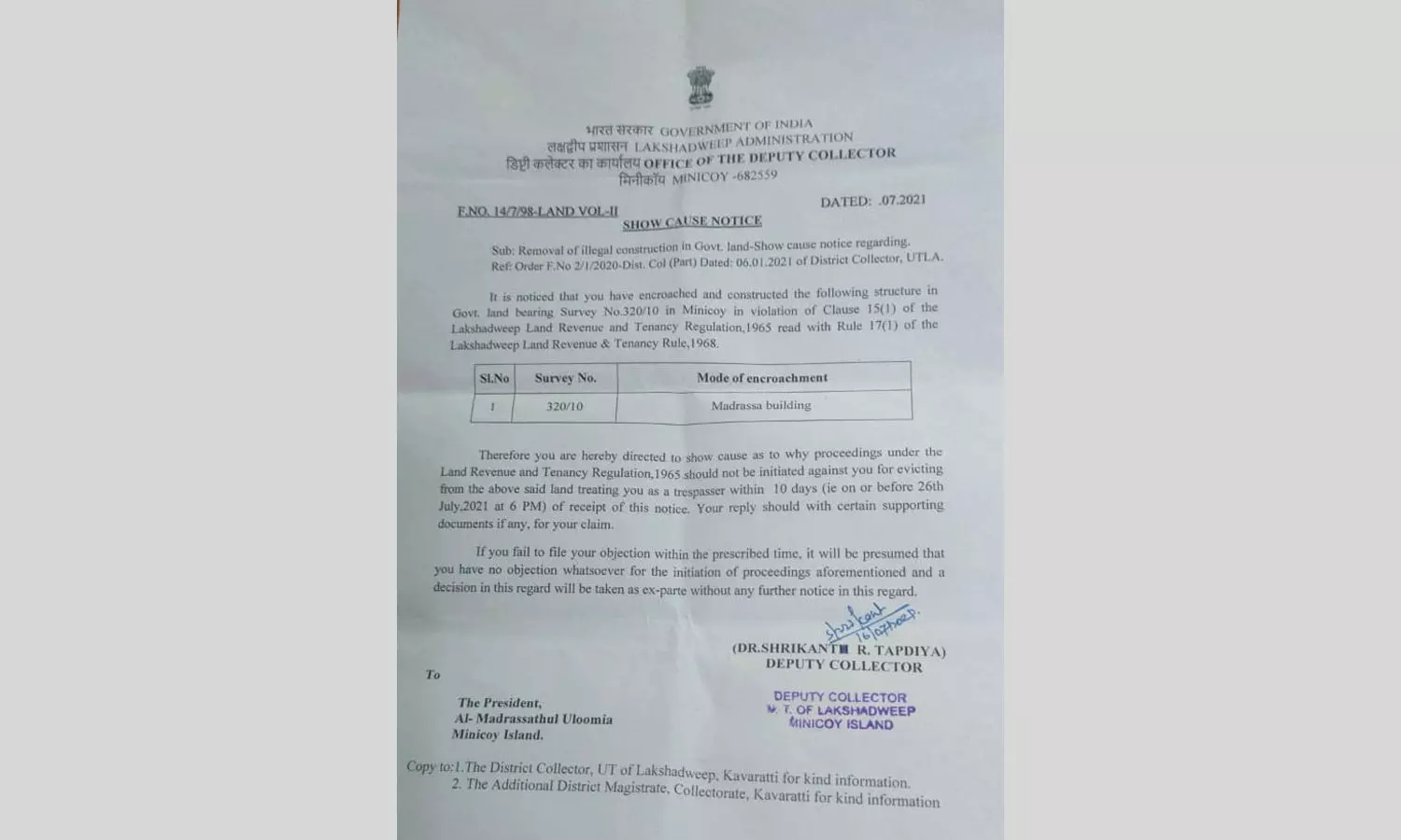 ലക്ഷദ്വീപ് മിനിക്കോയിയിലെ മദ്രസാ കെട്ടിടം പൊളിച്ചു നീക്കാന് നോട്ടീസ്