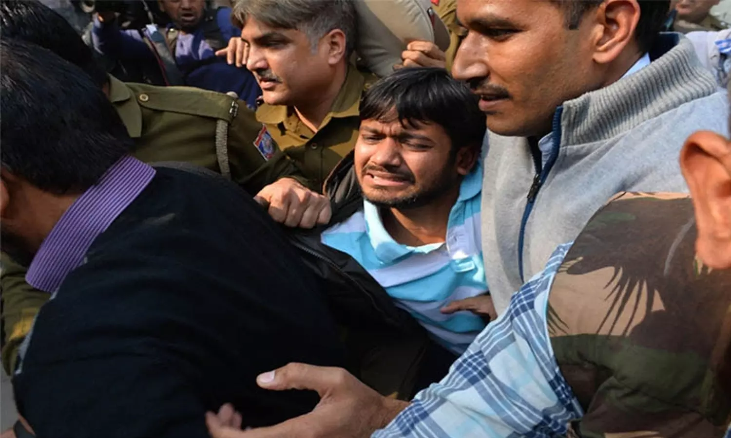 2016 ആസാദി മുദ്രാവാക്യം മുഴക്കിയത് രാജ്യദ്രോഹപരമാണെന്ന് ആരോപിച്ച് ഡല്ഹി പൊലീസ് കനയ്യയെ അറസ്റ്റ് ചെയ്തു. കോടതിയില് ഹാജരാക്കാനായി കൊണ്ടുവന്ന കനയ്യയെ കോടതിക്ക് മുന്നില്വെച്ച് സംഘപരിവാര് അനുകൂലികള് ആക്രമിച്ചത് വലിയ വിവാദമായി. തുടര്ന്ന് സുപ്രീംകോടതി ഇടപെടുകയും അദ്ദേഹത്തിന് ജാമ്യം ലഭിക്കുകയും ചെയ്തു. ജാമ്യം ലഭിച്ചതിന് ശേഷം രാത്രിയോടെ ജെ.എന്.യു ക്യാമ്പസിലെത്തിയ കനയ്യയെ സ്വീകരിക്കാന് നൂറുകണക്കിന് വിദ്യാര്ഥികളാണ് ഒത്തുകൂടിയത്. അവിടെവെച്ച് അദ്ദേഹം വീണ്ടും ആസാദി മുദ്രാവാക്യം മുഴക്കി ദേശീയ ശ്രദ്ധയാകര്ഷിച്ചു.