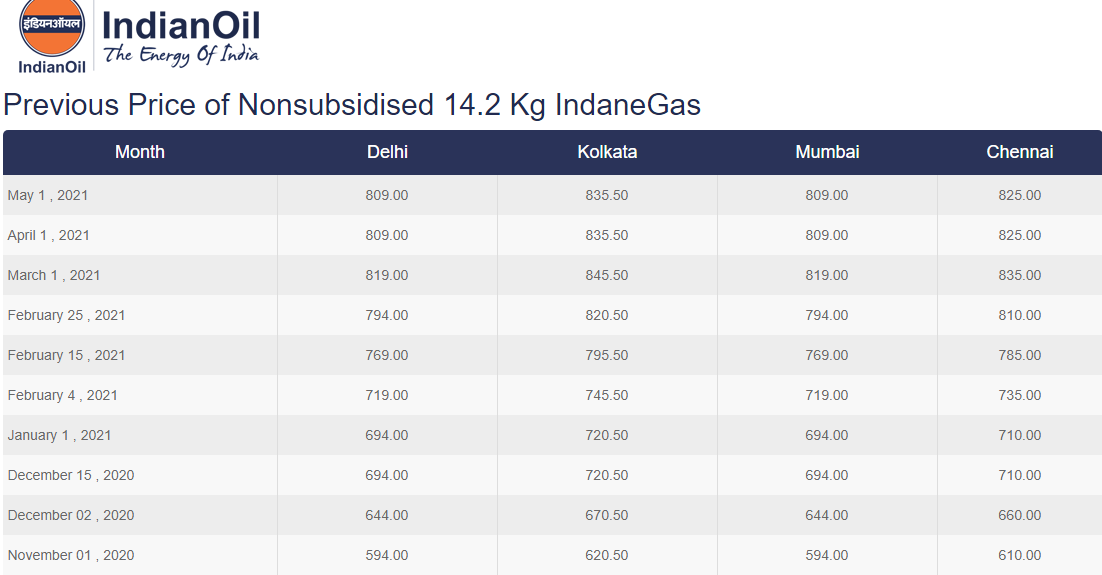 കഴിഞ്ഞ വർഷം നവംബർ 30ന് സിലിണ്ടർ ഒന്നിന് 594 രൂപയായിരുന്നു വില. ഡിസംബറിൽ വില 694 രൂപയായി. ജനുവരിയിൽ വീണ്ടും വർധിപ്പിച്ച് 694 രൂപയായി. ഫെബ്രുവരിയിൽ 769 രൂപയാക്കി വർധിപ്പിച്ചു. മാർച്ച് ഒന്നിന് 819 രൂപയായി. ഏതാനും മാസങ്ങളുടെ ഇടവേളയ്ക്ക് ശേഷം ഇതാണിപ്പോൾ 834 ആയി വർധിപ്പിച്ചത്. കേരളത്തിൽ 841 രൂപയും ചെന്നൈയിൽ 850 രൂപയാണ് വില. കൊൽക്കത്തയിലാണ് ഏറ്റവും കൂടുതൽ വില; 861 രൂപ. വാണിജ്യാവശ്യങ്ങൾക്കുള്ള സിലിണ്ടറിൽ 84 രൂപയുടെ വർധയാണ് വരുത്തിയത്. 1150 രൂപയാണ് പുതുക്കിയ വില.
