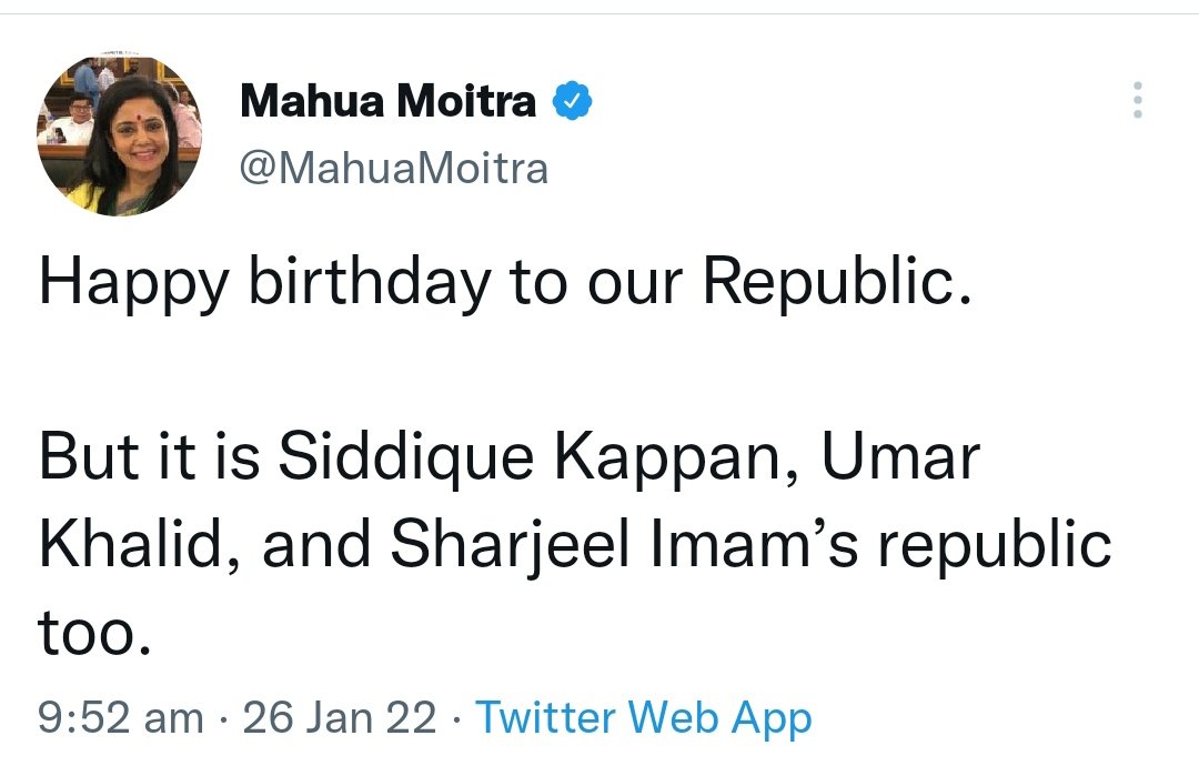 'നമ്മുടെ റിപബ്ലികിന് സന്തോഷ ജന്മദിനം. എന്നാൽ ഇത് സിദ്ദീഖ് കാപ്പന്റെയും ഉമർ ഖാലിദിന്റെയും ഷർജീൽ ഇമാമിന്റെയും കൂടി റിപബ്ലികാണ്' എന്നാണ് തൃണമൂൽ എംപി ട്വിറ്ററിൽ എഴുതിയത്.