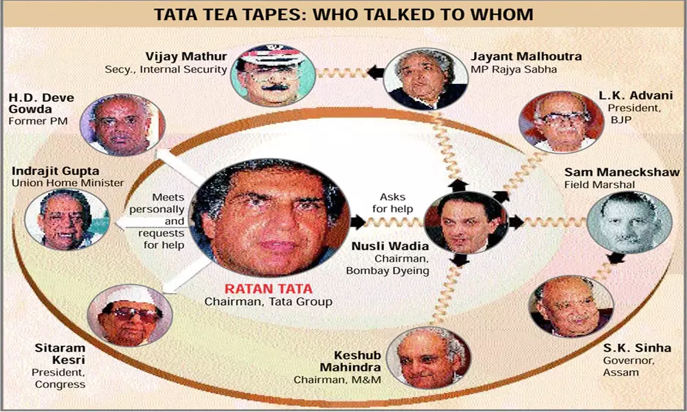 വലിയ രീതിയിലുള്ള സംഭാഷണ ചോർച്ച നടന്ന കേസാണ് ടാറ്റ ടേപ്സിലേത്. വ്യവസായികളായ നുസ്ലി വാഡിയ, രത്തൻ ടാറ്റ, കേശബ് മഹിന്ദ്ര, തുടങ്ങിയവർ തമ്മിലുള്ള സംഭാഷണങ്ങളാണ് ഇതിലുള്ളത്. ഇന്ത്യൻ എക്സ്പ്രസ് പുറത്ത് വിട്ട സംഭാഷണത്തിൽ അസമിൽ ടാറ്റയുടേതുൾപ്പെടെയുള്ള തേയിലത്തോട്ടങ്ങളിൽ ഉൾഫ അന്യായമായി പണം കവരുന്നുവെന്ന പരാതിയിൽ കേന്ദ്രം ഇടപെടണമെന്ന് ആവശ്യപ്പെട്ട വിവരങ്ങളാണ് ഉണ്ടായിരുന്നത്. ചോർച്ചയിൽ അന്നത്തെ പ്രധാനമന്ത്രി ഐ.കെ ഗുജ്റാൾ സി.ബി.ഐ അന്വേഷണത്തിന് ഉത്തരവിട്ടു. എന്നാൽ തെളിവിന്റെ അഭാവം കാണിച്ച അന്വേഷണം അവസാനിപ്പിക്കുകയായിരുന്നു.