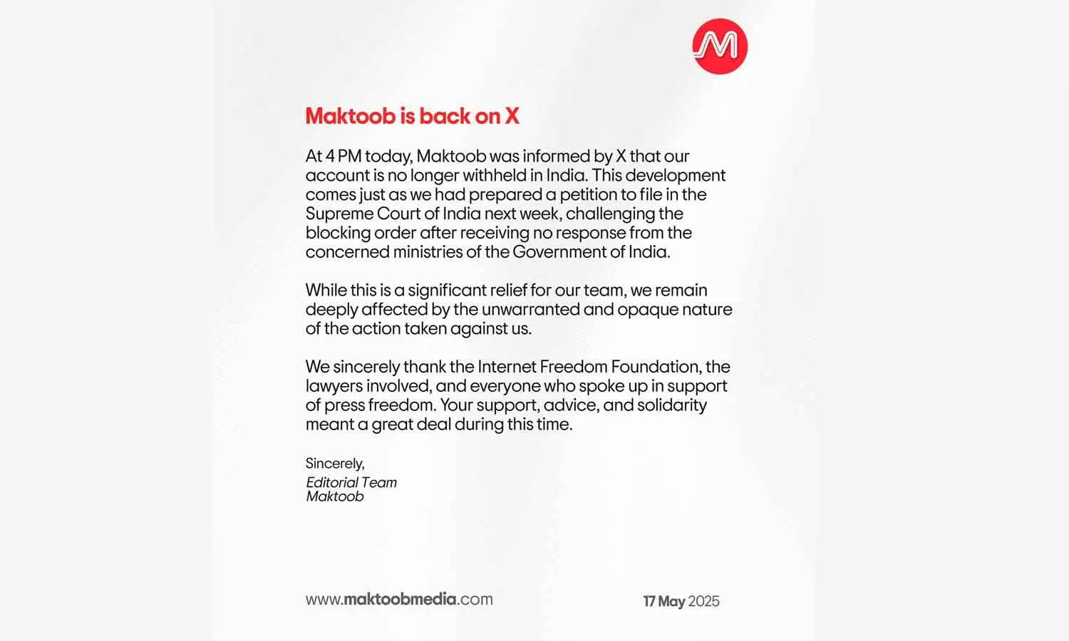 മേയ് എട്ടിനാണ് മക്തൂബിന്റെ എക്സ് അക്കൗണ്ട് മരവിപ്പിച്ചത്.