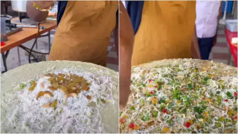 ചോക്ലേറ്റ് ബിരിയാണി, ചൂട് ഐസ്ക്രീം തുടങ്ങി മാരകമായ ഫുഡ് കോമ്പിനേഷനുകള്ക്ക് സോഷ്യല്മീഡിയ സാക്ഷിയാകാറുണ്ട്. അതുപോലെ പറക്കും ദോശ, തീപ്പൊരി ദോശ അങ്ങനെ പല തരത്തിലുള്ള ദോശകളും. അത്തരത്തിലൊരു ദോശയാണ് സമൂഹമാധ്യമങ്ങളില് വൈറലായിക്കൊണ്ടിരിക്കുന്നത്.