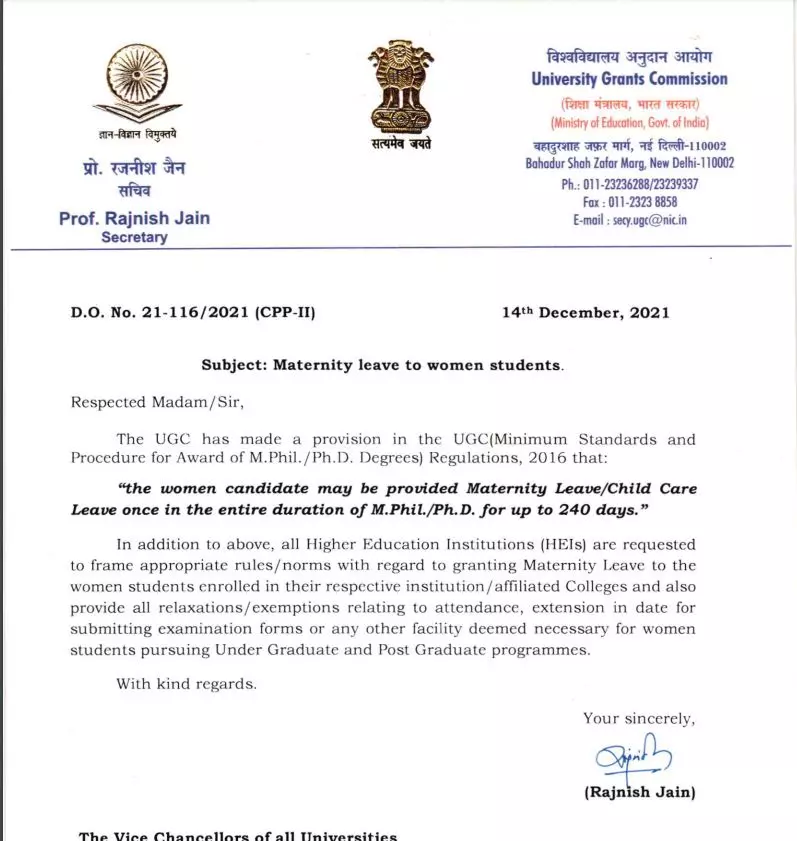 വനിതകളായ ഗവേഷക വിദ്യാർഥികൾക്ക് പ്രസവത്തിനും കുഞ്ഞുങ്ങളെ പരിചരിക്കുന്നതിനുമായി എട്ടുമാസത്തെ പ്രസവാവധി നൽകാൻ യുജിസി തീരുമാനിച്ചു. എം.ഫിൽ, പിഎച്ച്ഡി വിദ്യാർഥിനികൾക്ക് ഗവേഷണത്തിനിടെ ഒറ്റതവണ 240 ദിവസം അവധിയെടുക്കാം.