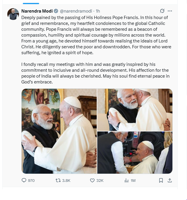 ''ഫ്രാൻസിസ് മാർപാപ്പയുടെ വിയോഗത്തിൽ അഗാധമായ വേദനയുണ്ട്. ദുഃഖത്തിന്റെയും ഓർമയുടെയും ഈ വേളയിൽ, ആഗോള കത്തോലിക്കാ സമൂഹത്തിന് എന്റെ ഹൃദയംഗമമായ അനുശോചനം അറിയിക്കുന്നു. ലോകമെമ്പാടുമുള്ള ദശലക്ഷക്കണക്കിന് ആളുകൾ കാരുണ്യത്തിന്റെയും വിനയത്തിന്റെയും ആത്മീയ ധൈര്യത്തിന്റെയും ഒരു ദീപസ്തംഭമായി ഫ്രാൻസിസ് മാർപാപ്പയെ എപ്പോഴും ഓർമിക്കും. ചെറുപ്പം മുതൽ, കർത്താവായ ക്രിസ്തുവിന്റെ ആദർശങ്ങൾ സാക്ഷാത്കരിക്കുന്നതിനായി അദ്ദേഹം സ്വയം സമർപ്പിച്ചു. ദരിദ്രരെയും അടിച്ചമർത്തപ്പെട്ടവരെയും അദ്ദേഹം ഉത്സാഹത്തോടെ സേവിച്ചു. കഷ്ടപ്പെടുന്നവർക്ക്, അദ്ദേഹം പ്രത്യാശയുടെ ചൈതന്യം ജ്വലിപ്പിച്ചു.