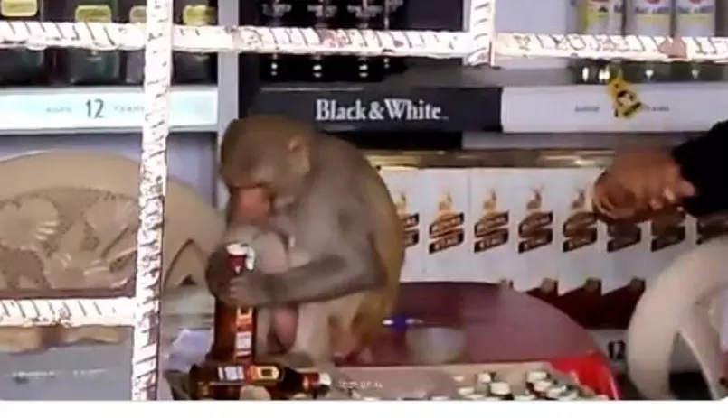 മധ്യപ്രദേശിലെ മാന്ദ്ല ജില്ലയിലുള്ള ഒരു മദ്യഷോപ്പിൽനിന്നുള്ള ഈ കൗതുകക്കാഴ്ച ഇപ്പോൾ സമൂഹമാധ്യമങ്ങളിൽ വൈറലാണ്. മദ്യഷോപ്പിൽ നിരത്തിവച്ച കുപ്പികളിൽ ഒന്നെടുത്തു 'വീശുക'യായിരുന്നു കുരങ്ങ്. കുപ്പിയുടെ അടപ്പ് തുറക്കാൻ കുറച്ചുനേരം പണിപ്പെട്ടു കുരങ്ങ്. ഇടയ്ക്ക് കടയുടമ ഒരു ബിസ്കറ്റ് നീട്ടിനൽകിയിട്ടും അതൊന്നും ശ്രദ്ധിക്കാൻ നേരമില്ലായിരുന്നു.