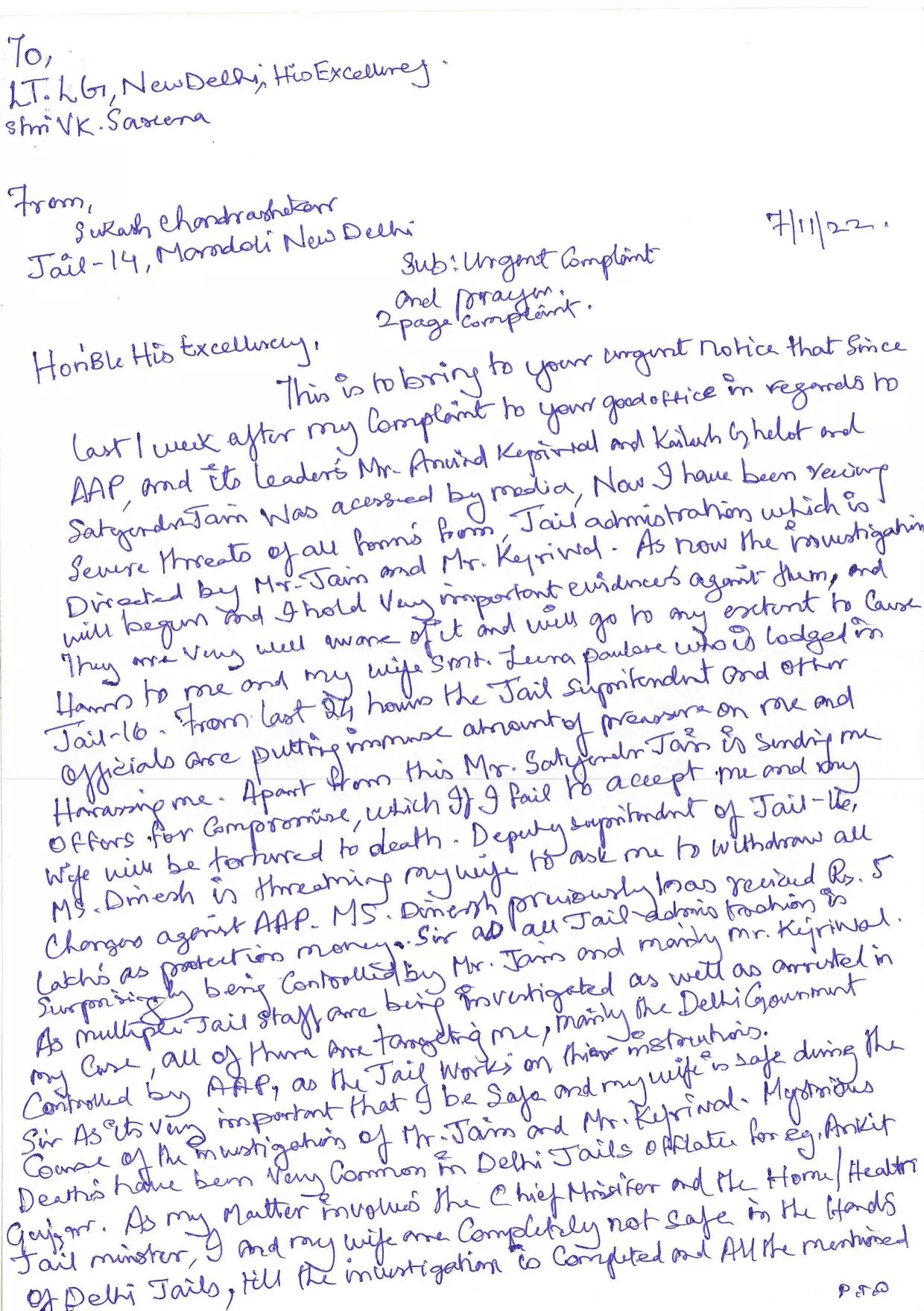 തന്നെയും ഭാര്യയെയും ഡല്ഹിക്ക് പുറത്തുള്ള മറ്റൊരു ജയിലിലേക്ക് മാറ്റണമെന്നും സുകേഷ് ആവശ്യപ്പെട്ടു. ആം ആദ്മി പാര്ട്ടിക്കെതിരെ സി.ബി.ഐ അന്വേഷണം ആവശ്യപ്പെട്ട് നേരത്തെ സുകേഷ് ഗവര്ണര്ക്ക് കത്തയച്ചിരുന്നു. തന്റെ സുരക്ഷയ്ക്കായി മന്ത്രി സത്യേന്ദർ ജെയിന് 10 കോടി രൂപ ഉൾപ്പെടെ എ.എ.പിക്കു പണം നൽകിയെന്നായിരുന്നു സുകേഷിന്റെ ആരോപണഫാർമസ്യൂട്ടിക്കൽ കമ്പനിയായ റാൻബാക്സിയുടെ പ്രൊമോട്ടർമാരായ ശിവിന്ദർ സിങ്, മൽവീന്ദർ സിങ് എന്നിവരുടെ കുടുംബത്തിൽ നിന്നാണ് സുകേഷ് ചന്ദ്രശേഖർ 200 കോടി തട്ടിയെടുത്തത്. തട്ടിപ്പു നടത്തിയതിന് ശേഷം ആഡംബര ജീവിതമാണ് ഇയാൾ നയിച്ചിരുന്നത്. ഇദ്ദേഹത്തിന്റെ 16 ലക്ഷ്വറി കാറുകളും കടലിനോട് അഭിമുഖമായ ബീച്ച് ബംഗ്ലാവും ഈയിടെ അന്വേഷണ സംഘം കണ്ടു കെട്ടിയിരുന്നു. ആന്ധ്ര, കേരളം, തമിഴ്നാട് എന്നിവിടങ്ങളിലെല്ലാം ഇദ്ദേഹത്തിന്റെ പേരിൽ വഞ്ചനാ കേസുകളുണ്ട്.