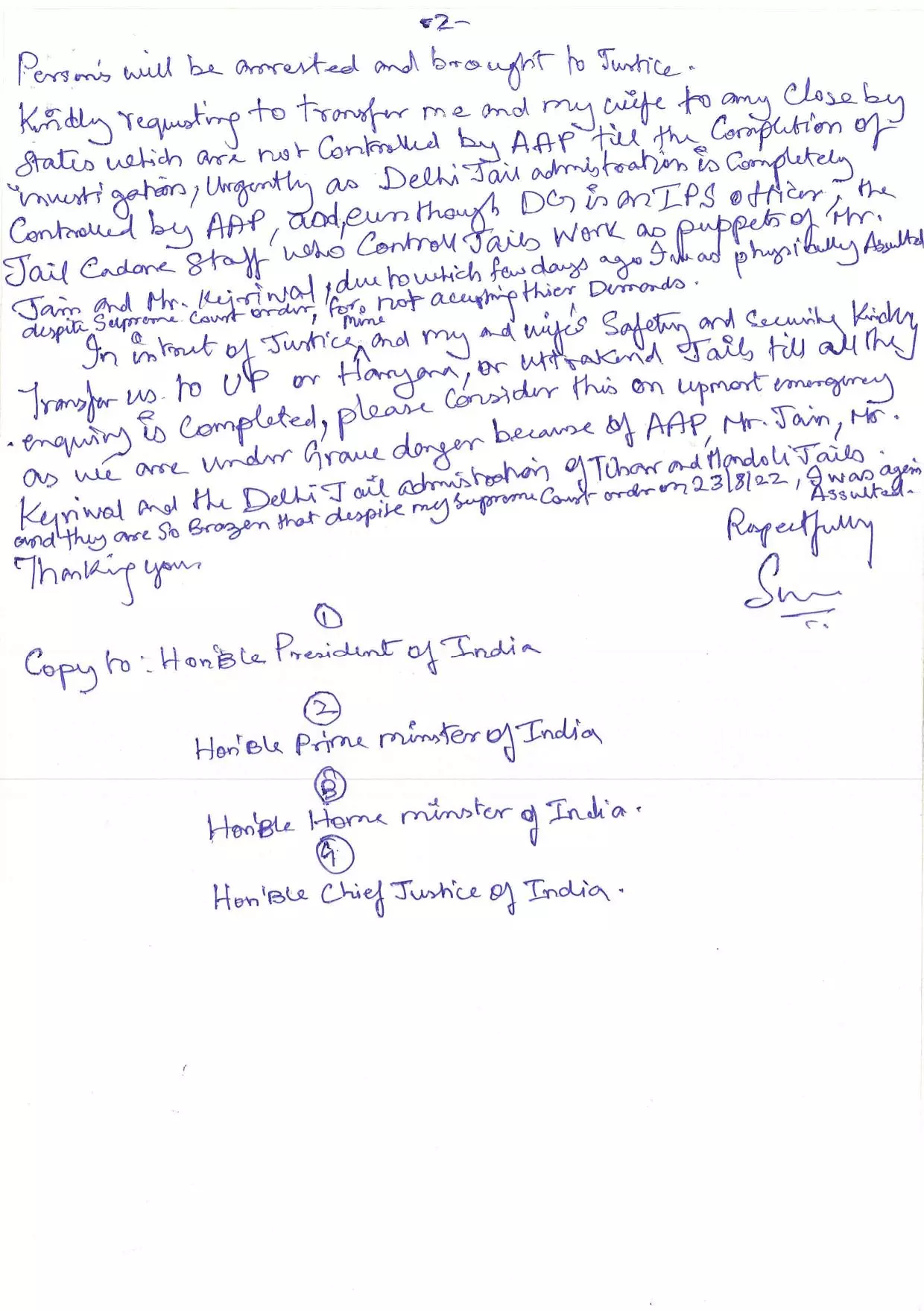 |തന്നെയും ഭാര്യയെയും ഉപദ്രവിക്കാൻ ജയിൽ അധികൃതരും എ.എ.പിയും ഏതറ്റം വരെയും പോകുമെന്നും സുകേഷ് ഗവര്ണര്ക്ക് അയച്ച അഞ്ചാമത്തെ കത്തില് പറയുന്നു