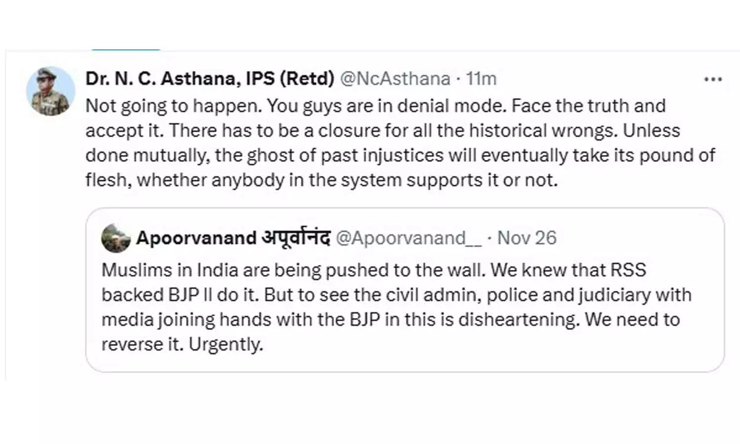 കോഴിക്കോട്: രാജ്യവ്യാപകമായി മുസ്ലിംകൾക്കെതിരെ നടക്കുന്ന അതിക്രമങ്ങളെ ന്യായീകരിച്ച് മുൻ കേരള ഡിജിപി എൻ.സി അസ്താന. അപൂർവാനന്ദ് എന്നയാളുടെ എക്സ് പോസ്റ്റിന് മറുപടിയായുള്ള കുറിപ്പിലാണ് എല്ലാം കാലം പകരം ചോദിക്കുന്നതാണ് എന്ന അസ്താനയുടെ മറുപടി. ഇന്ത്യയിലെ മുസ്ലിംകൾ മതിൽക്കെട്ടിനകത്തേക്ക് തള്ളപ്പെടുകയാണ്. ആർഎസ്എസ് ആശയക്കാരായ ബിജെപി അത് ചെയ്യുന്നതിൽ അത്ഭുതമില്ല. എന്നാൽ ഉദ്യോഗസ്ഥരും പൊലീസും നീതിപീഠവും മാധ്യമങ്ങളും ഇതിനായി ബിജെപിക്കൊപ്പം കൈകോർക്കുന്നത് നിരാശാജനകമാണ്. അടിയന്തരമായി അത് അവസാനിപ്പിക്കണം എന്നായിരുന്നു അപൂർവാനന്ദിന്റെ കുറിപ്പ്.