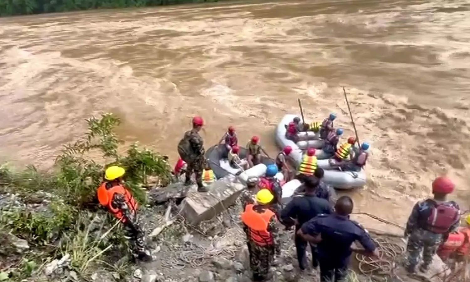 ഏഴ് ഇന്ത്യക്കാരുൾപ്പെടെ 54 യാത്രക്കാരുമായി പോയ രണ്ട് ബസുകളാണ് ത്രിശൂലി നദിയിലേക്ക് ഒലിച്ചുപോയത്