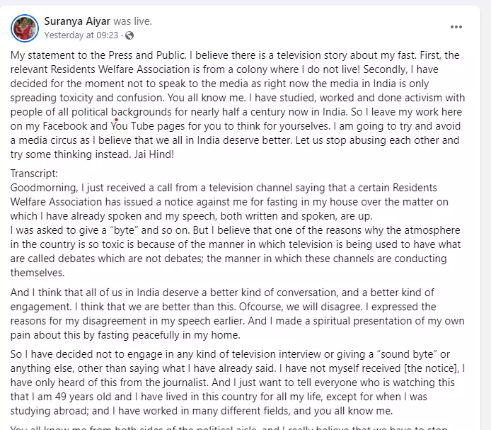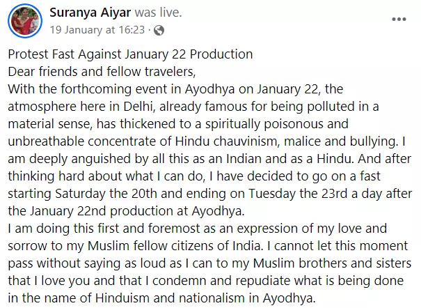 ഹിന്ദുമതത്തിൻ്റെയും ദേശീയതയുടെയും പേര് പറഞ്ഞ് നടത്തുന്ന അതിക്രമങ്ങളെ അപലപിച്ചും മുസ്ലിം പൗരന്മാരോട് ഐക്യദാർഢ്യം പ്രകടിപ്പിച്ചും രാമക്ഷേത്ര പ്രതിഷ്ഠാ ചടങ്ങിനെതിരെ നിലപാടെടുത്ത സുരണ്യ അയ്യർ മൂന്ന് ദിവസം ഉപവാസം അനുഷ്ഠിച്ച് പ്രതിഷേധിച്ചിരുന്നു. ജനുവരി 20 മുതൽ 23 വരെ ഉപവാസം അനുഷ്ഠിക്കുന്ന വിവരം സുരണ്യ സോഷ്യൽ മീഡിയയിൽ പങ്കുവെക്കുകയും ചെയ്തു.