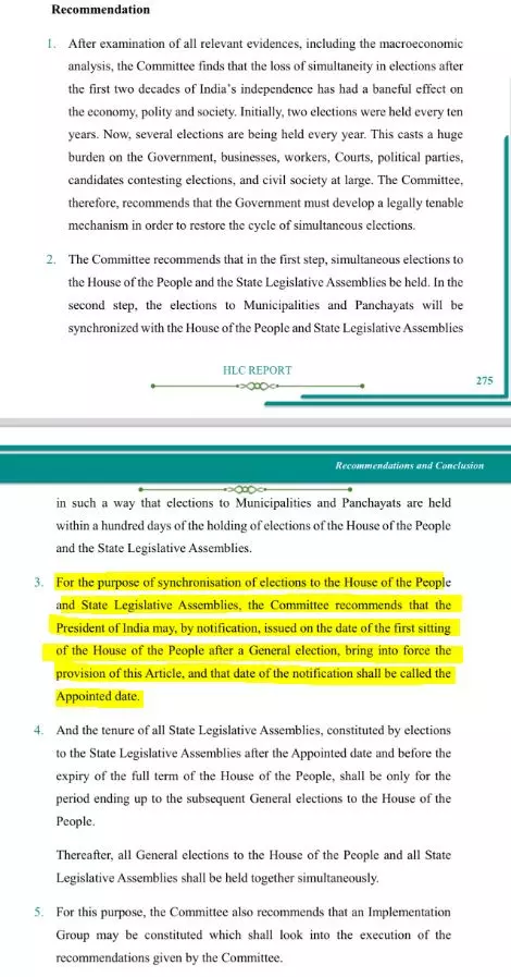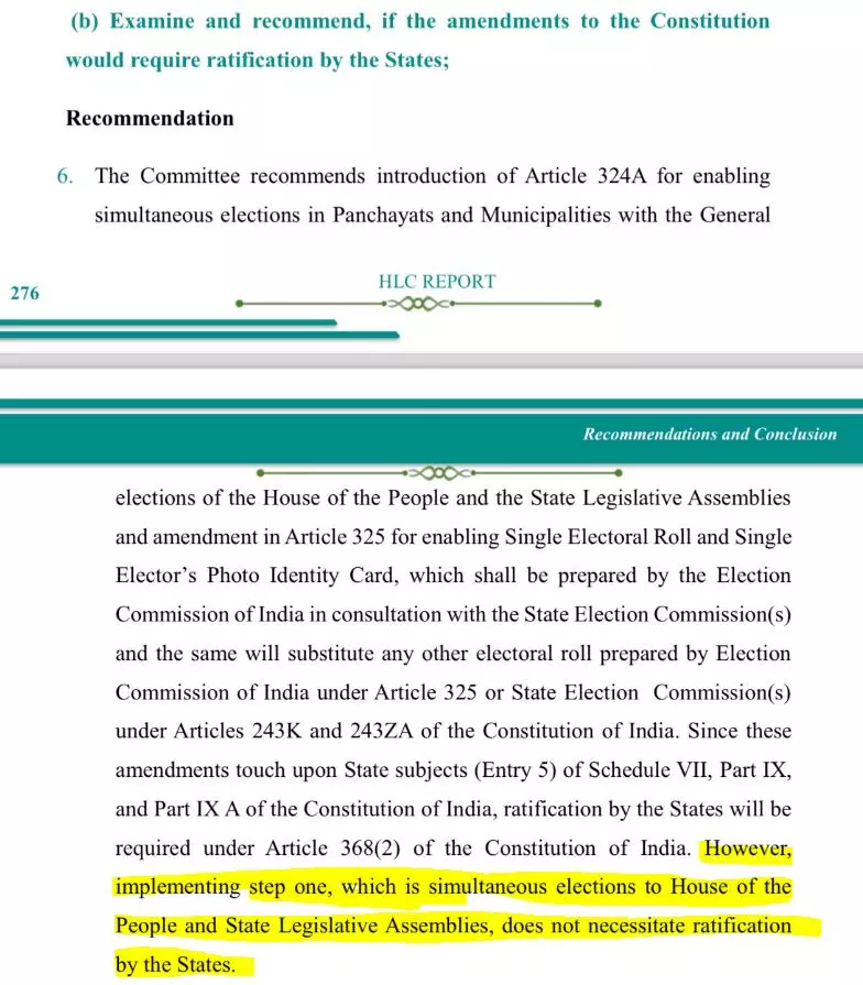 തദ്ദേശ തെരഞ്ഞെടുപ്പുകൾ ഒന്നിച്ചു നടത്തുന്നതിന് മാത്രമേ സംസ്ഥാന നിയമസഭകളുടെ അനുമതി വേണ്ടതുള്ളൂ, ലോക്സഭാ-നിയമസഭാ തെരഞ്ഞെടുപ്പുകൾക്ക് അത് വേണ്ടതില്ല എന്നാണ് വിദഗ്ധ സമിതി റിപ്പോർട്ടിൽ പറയുന്നത്.