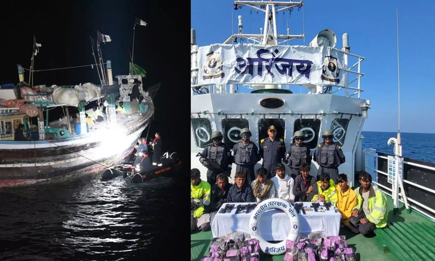 ഗുജറാത്ത് എ ടി എസിന്റെ ഇൻറലിജൻസ് വിഭാഗം നൽകിയ വിവരത്തിന്റെ അടിസ്ഥാനത്തില് ഞായറാഴ്ച രാത്രിയാണ് തിരച്ചില് നടന്നത്. തീര അതിർത്തിക്കടുത്ത് വച്ചാണ് അൽ സൊഹൈല് എന്ന മത്സ്യബന്ധന ബോട്ട് കണ്ടെത്തിയത്. നിലവിൽ ബോട്ടും കസ്റ്റഡിയിലായവരെയും തുടരന്വേഷണത്തിനായി ഗുജറാത്തിലെ ഒഖയിലേക്ക് കൊണ്ടുപോയിരിക്കുകയാണ്.