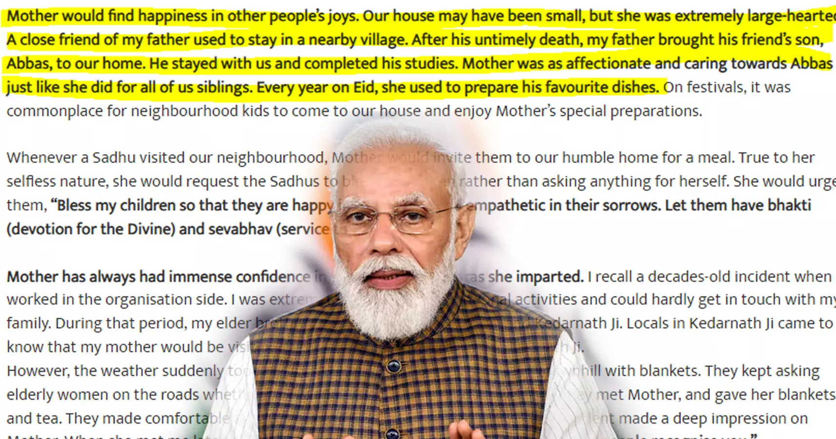 'മറ്റുള്ളവരുടെ ആഹ്ളാദങ്ങളിൽ അമ്മ സന്തോഷം കണ്ടെത്തിയിരുന്നു. ഞങ്ങളുടെ വീട് ചെറുതായിരുന്നെങ്കിലും അവരുടെ ഹൃദയം വിശാലമായിരുന്നു. ഞങ്ങളുടെ ഗ്രാമത്തിനടുത്ത് അച്ഛന്റെ സുഹൃത്ത് താമസിച്ചിരുന്നു. അസമയത്തുള്ള അദ്ദേഹത്തിന്റെ മരണശേഷം എന്റെ അച്ഛൻ സുഹൃത്തിന്റെ മകൻ, അബ്ബാസിനെ വീട്ടിൽ കൊണ്ടുവന്നു. ഞങ്ങൾക്കൊപ്പം താമസിച്ചാണ് അവൻ പഠനം പൂർത്തിയാക്കിയത്. ഞങ്ങൾ സഹോദരങ്ങളോടെന്ന പോലെ അമ്മയ്ക്ക് അവനോട് വാത്സല്യവും കരുതലുമുണ്ടായിരുന്നു. എല്ലാ വർഷവും പെരുന്നാളിൽ അമ്മ അവന് ഇഷ്ടപ്പട്ട ഭക്ഷണം പാചകം ചെയ്തു കൊടുത്തു. ആഘോഷങ്ങളിൽ അടുത്തുള്ള വീട്ടിലെ കുട്ടികളെല്ലാം ഞങ്ങളുടെ വീട്ടിലെത്തി അമ്മയുടെ പ്രത്യേക വിഭവങ്ങൾ ആസ്വദിക്കുമായിരുന്നു' - മോദി എഴുതി.