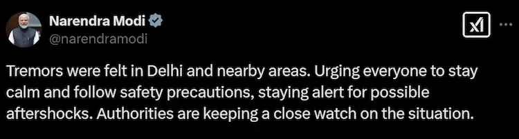 "ഡൽഹിയിലും സമീപ പ്രദേശങ്ങളിലും ഭൂചലനം അനുഭവപ്പെട്ടു. എല്ലാവരോടും ശാന്തരായിരിക്കാനും സുരക്ഷാ മുൻകരുതലുകൾ പാലിക്കാനും ഞാൻ അഭ്യർത്ഥിക്കുന്നു. തുടർ ചലനങ്ങൾക്ക് സാധ്യതയുള്ളതിനാൽ ജാഗ്രത പാലിക്കുക. അധികൃതർ സ്ഥിതിഗതികൾ സൂക്ഷ്മമായി നിരീക്ഷിച്ചുകൊണ്ടിരിക്കുകയാണ്" പ്രധാനമന്ത്രി എക്സിൽ കുറിച്ചു.