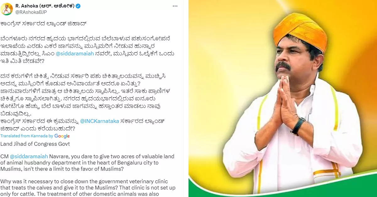 'പശുക്കളെയും മറ്റ് മൃഗങ്ങളെയും ചികിത്സിക്കുന്ന സർക്കാർ മൃഗാശുപത്രി അടച്ചുപൂട്ടി മുസ്ലിംകൾക്ക് കൈമാറേണ്ട ആവശ്യം എന്തായിരുന്നു? വെറ്ററിനറി ആശുപത്രി സ്ഥാപിച്ചത് കന്നുകാലികളെ ചികിത്സിക്കാൻ മാത്രമല്ല, മറ്റ് വളർത്തുമൃഗങ്ങൾക്കും അവിടെ ചികിത്സ നൽകാം. 500 കോടി വിലമതിക്കുന്ന ഭൂമി കൈമാറാൻ അനുവദിക്കില്ല. കോൺഗ്രസ് സർക്കാരിന്റെ ഈ നടപടിയെ നമുക്ക് ലാൻഡ് ജിഹാദ് എന്ന് വിളിക്കാമോ?' ഐഎൻസി കർണാടക ഹാൻഡിലിനെ മെൻഷൻ ചെയ്ത് അശോക ചോദിച്ചു.