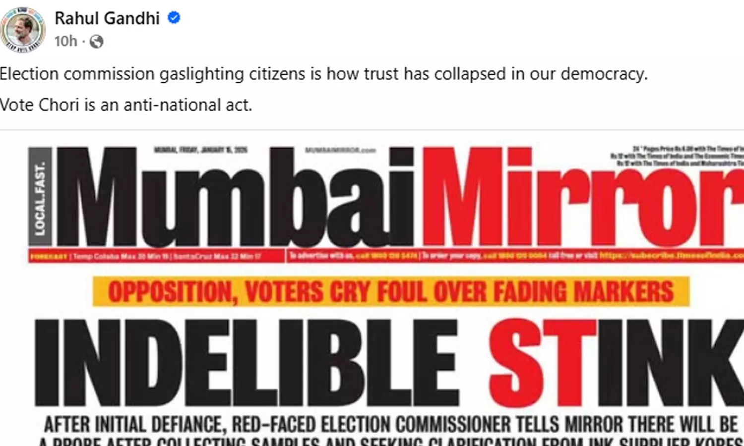 ന്യൂഡൽഹി: തെരഞ്ഞെടുപ്പ് കമ്മീഷൻ ജനാധിപത്യത്തിലുള്ള വിശ്വാസം തകർന്നുവെന്ന് രാഹുൽ ഗാന്ധി. കമ്മീഷൻ പൗരന്മാരെ ഗ്യാസ് ലൈറ്റ് ചെയ്യുകയാണ്. വോട്ട് ചോരി ഒരു ദേശവിരുദ്ധ പ്രവൃത്തിയാണെന്നും രാഹുൽഗാന്ധി ഫേസ്ബുക്ക് പോസ്റ്റിൽ പറഞ്ഞു. മഹാരാഷ്ട്രയിലെ തദ്ദേശ സ്ഥാപനങ്ങളിലേക്കുള്ള തെരഞ്ഞെടുപ്പിൽ കൃത്രിമം ആരോപിച്ച് പ്രതിപക്ഷം രംഗത്തെത്തിയിരുന്നു. വോട്ടർമാരുടെ വിരലുകളിൽ അടയാളപ്പെടുത്താൻ ഉപയോഗിക്കുന്ന മായ്ക്കാൻ കഴിയാത്ത മഷിക്ക് പകരമായി മാർക്കർ പേനകൾ ഉപയോഗിച്ചതായാണ് ആരോപണം. ഇതിന് പിന്നാലെയാണ് പ്രതികരണം.