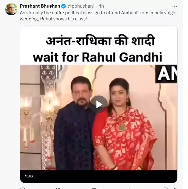 അംബാനിയുടെ അശ്ലീലം നിറഞ്ഞ വിവാഹത്തിൽ എല്ലാ വിഭാഗം രാഷ്ട്രീയക്കാരും പങ്കെടുത്തപ്പോൾ രാഹുൽ തന്റെ ക്ലാസ് തെളിയിച്ചു എന്ന് പ്രമുഖ അഭിഭാഷകൻ പ്രശാന്ത് ഭൂഷൻ എക്സിൽ കുറിച്ചു. അംബാനിയുടെ വിവാഹത്തിൽ രാഷ്ട്രീയ നേതാക്കൾ പങ്കെടുക്കുന്നതിനെ കുറിച്ച് രാഹുൽ സംസാരിക്കുന്ന വീഡിയോയും അദ്ദേഹം പങ്കുവച്ചിട്ടുണ്ട്.