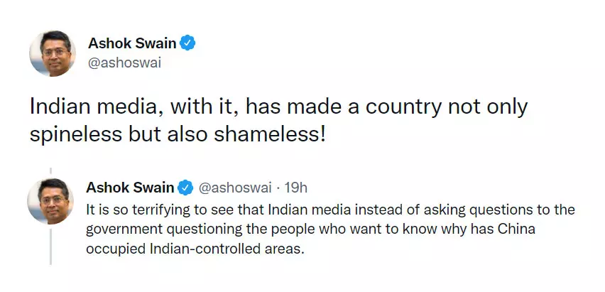 ചൈനയുടെ കൈയേറ്റത്തിൽ കോൺഗ്രസിനെ കുറ്റപ്പെടുത്തുന്ന ഇന്ത്യാ ടുഡേക്കും രാഹുൽ കൻവലിനുമെതിരെ വൻ പ്രതിഷേധമാണ് സമൂഹമാധ്യമങ്ങളിൽ ഉയരുന്നത്. ഇന്ത്യൻ മാധ്യമങ്ങൾ നട്ടെല്ലില്ലാത്ത സമൂഹത്തെ മാത്രമല്ല നാണമില്ലാത്തവരെ കൂടിയാണ് സൃഷ്ടിച്ചിരിക്കുന്നതെന്ന് സ്വീഡനിലെ ഉപ്പസാല യുണിവേഴ്സിറ്റി പ്രൊഫസറും മനുഷ്യാവകാശ പ്രവർത്തകനുമായ അശോക് സ്വെയ്ൻ ആരോപിച്ചു.