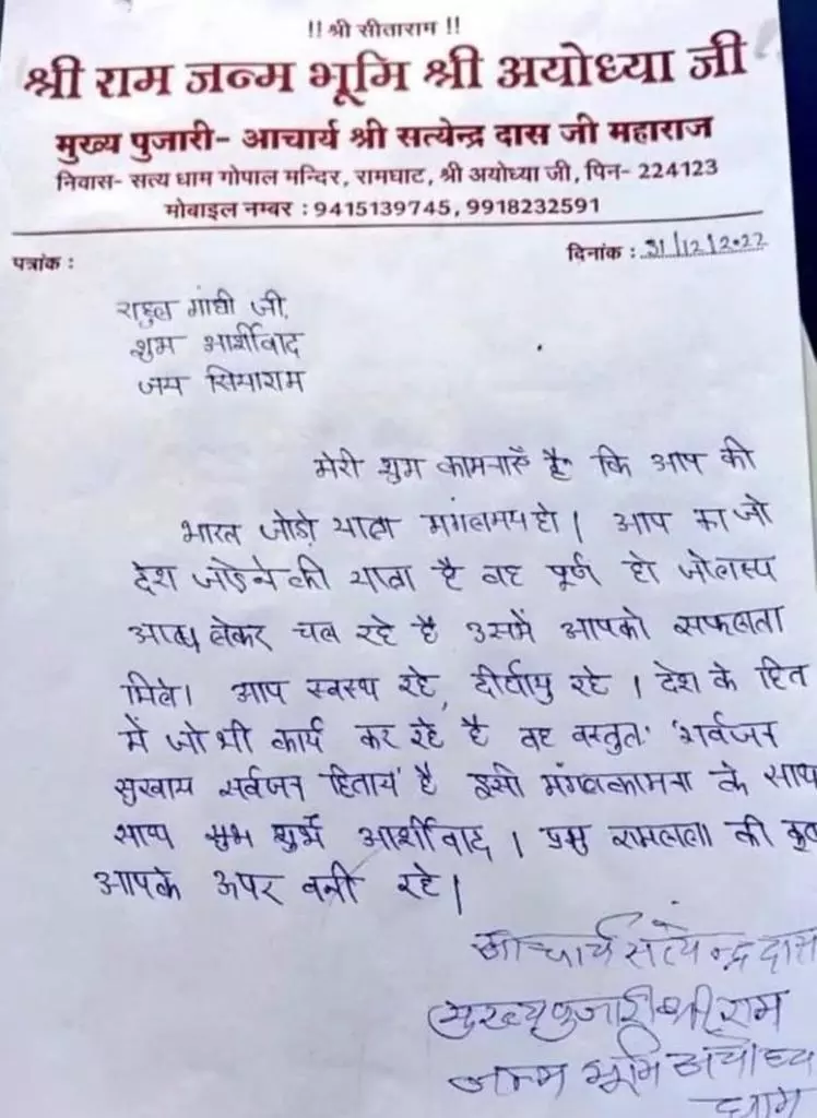 നിങ്ങളുടെ ദൗത്യം വിജയിക്കട്ടെ; ഭാരത് ജോഡോ യാത്രയ്ക്ക് ആശംസകൾ നേർന്ന് രാമക്ഷേത്രം മുഖ്യ പുരോഹിതന്