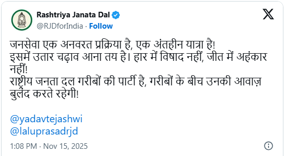 എക്സ് പോസ്റ്റിലൂടെയാണ് ആർജെഡിയുടെ പ്രതികരണം. രാഷ്ട്രീയത്തിലെ ഉയർച്ച താഴ്ചകളുടെ ഭാഗമായിട്ടാണ് തോൽവിയെ കാണുന്നതെന്നാണ് പ്രതികരണം. പൊതുജനങ്ങളെ സേവിക്കുന്നത് നിരന്തരമായ പ്രക്രിയയാണെന്നും, അതൊരു അനന്തമായ യാത്രയാണെന്നും പോസ്റ്റിൽ പറയുന്നു. ഉയർച്ച താഴ്ചകൾ അനിവാര്യമാണ്. പരാജയത്തിൽ നിരാശയില്ല, വിജയത്തിൽ അഹങ്കാരവുമില്ല. രാഷ്ട്രീയ ജനതാദൾ പാവങ്ങളുടെ പാർട്ടിയാണ്, അവർക്കുവേണ്ടി തുടർന്നും ശബ്ദം ഉയർത്തുമെന്നും പോസ്റ്റിൽ പറയുന്നു.