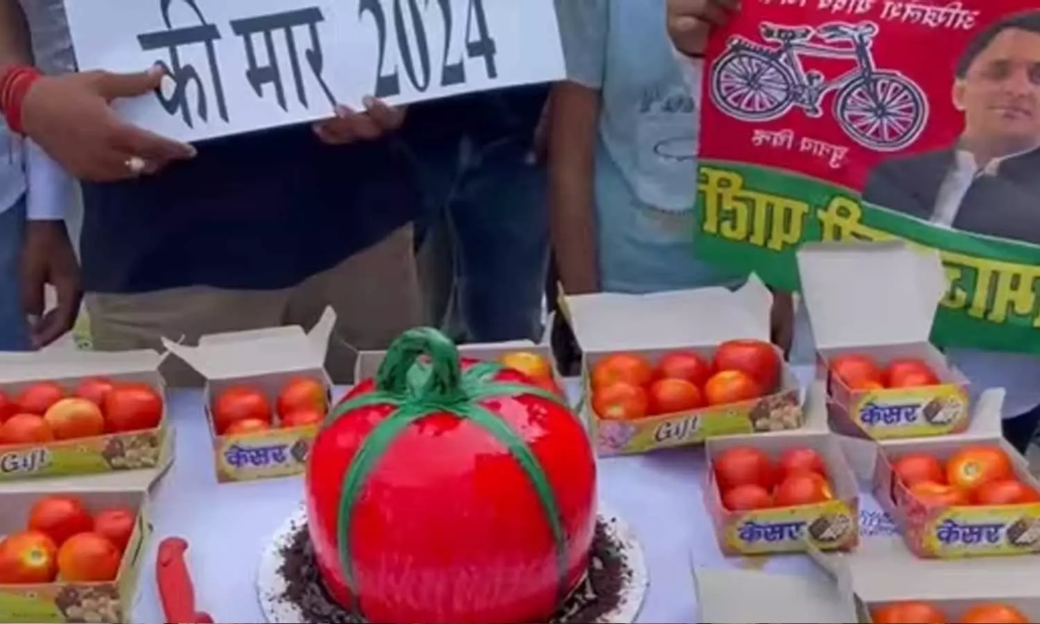 പാർട്ടി പ്രവർത്തകർ തക്കാളി ആകൃതിയിലുള്ള കേക്ക് മുറിച്ച് ജന്മദിനം ആഘോഷിക്കുന്നതും തക്കാളി നിറച്ച പെട്ടികൾ വിതരണം ചെയ്യുന്നതും വീഡിയോയിൽ കാണാം.