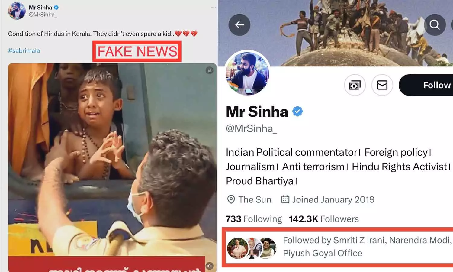 ആൾട്ട് ന്യൂസിലെ മാധ്യമപ്രവർത്തകൻ മുഹമ്മദ് സുബൈറാണ് വിദ്വേഷ ട്വീറ്റുകൾ പുറത്തുവിട്ടത്. കേരളത്തിൽ ഹിന്ദുക്കളായതിന്റെ പേരിൽ കുട്ടികളെപ്പോലും വെറുതെവിടുന്നില്ല എന്ന തലക്കെട്ടിലാണ് ഒരു ട്വീറ്റ്. മിസ്റ്റർ സിൻഹ എന്ന എക്കൗണ്ടിൽനിന്നാണ് ഈ പോസ്റ്റ്. പ്രധാനമന്ത്രി നരേന്ദ്ര മോദി, കേന്ദ്ര മന്ത്രിമാരായ സ്മൃതി ഇറാനി, പിയൂഷ് ഗോയൽ തുടങ്ങിയവർ ഈ എക്കൗണ്ട് ഫോളോ ചെയ്യുന്നുണ്ട്.